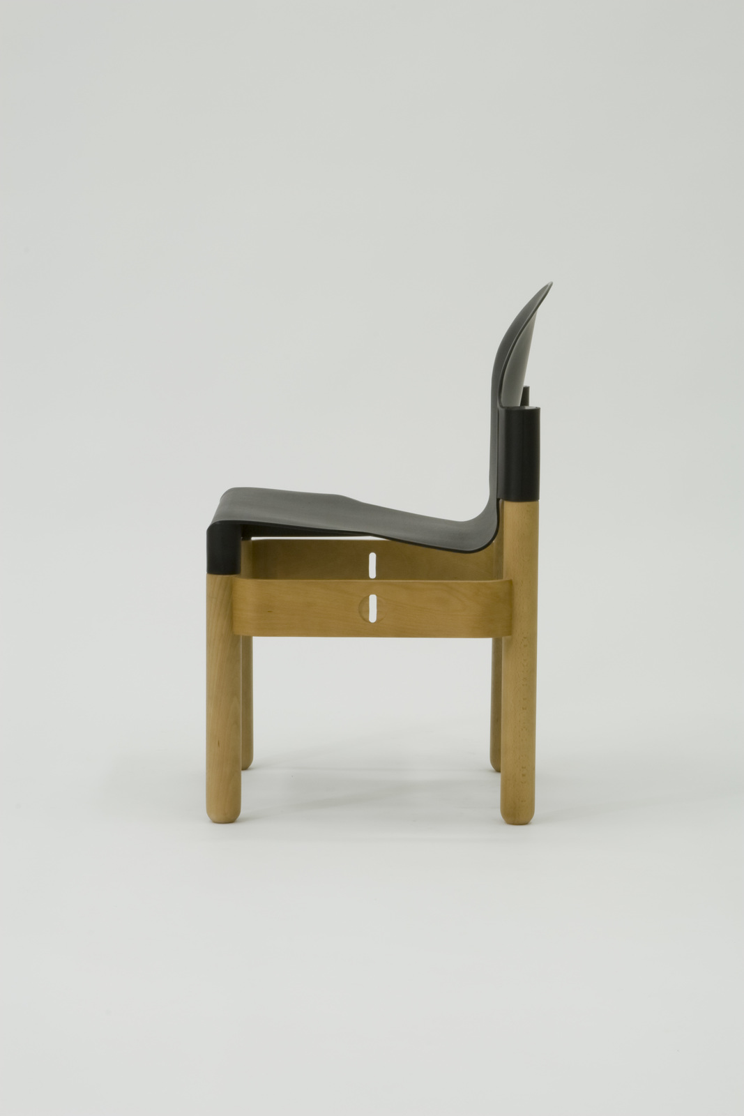 曲木家具の長い歴史を持つトーネット本社が、時代の要請を受け、ゲルト・ランゲによるデザインのポリプロピレンとブナの組合せによるシステム家具である。座から背の表面を梨地にすることで滑り止めを効かせ、脚との組立も特別な器材を使用せずにできるようになっている。連結やスタッキング機能も持っているので、家庭やオフィスだけでなく、ホールなどで大量に使用した場合に対応できるように、シートナンバーの取り付けにも対応できる。システム椅子として細部まで配慮が行き届いた椅子である。 |