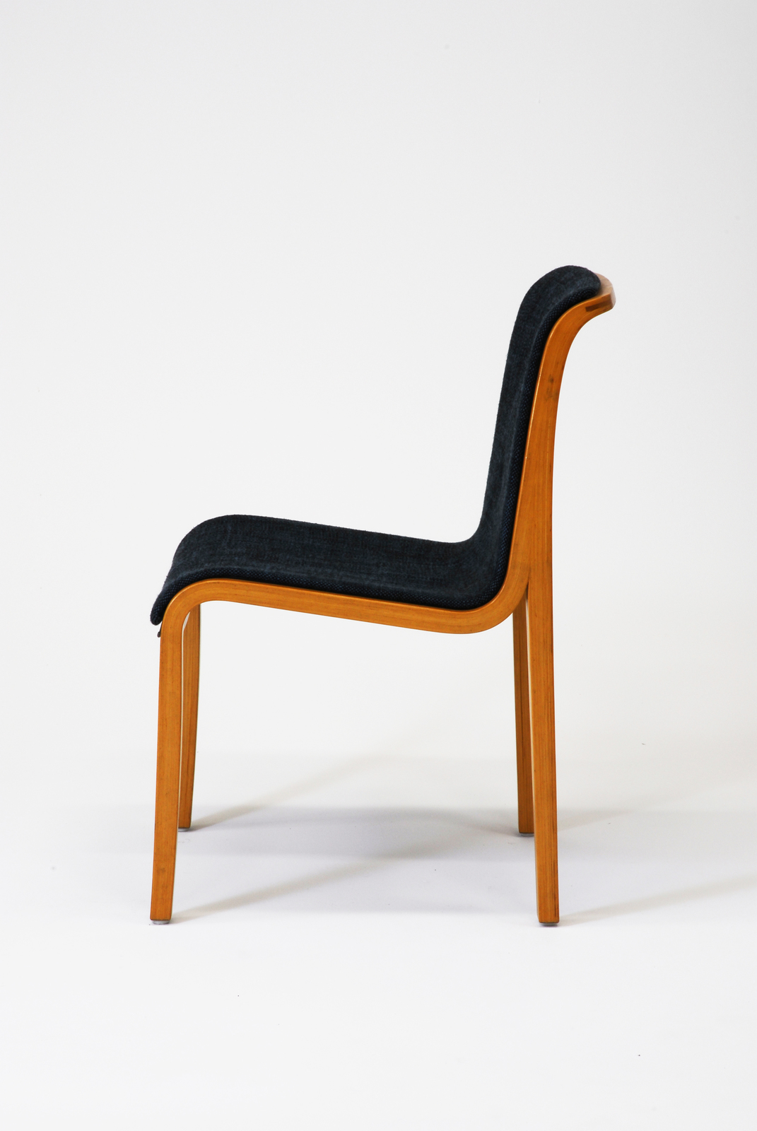 成形合板によって側面のフレームが構成されていて 背は前脚からつながる部分と後脚からつながる部分が合流するようなかたちで接合されている。脚は場所によって厚さの異なる不等厚の成形合板でくつくられている。そのため貫がなくても強い構造になっていて、しかも脚元がすっきりしたデザインとなっている。 |