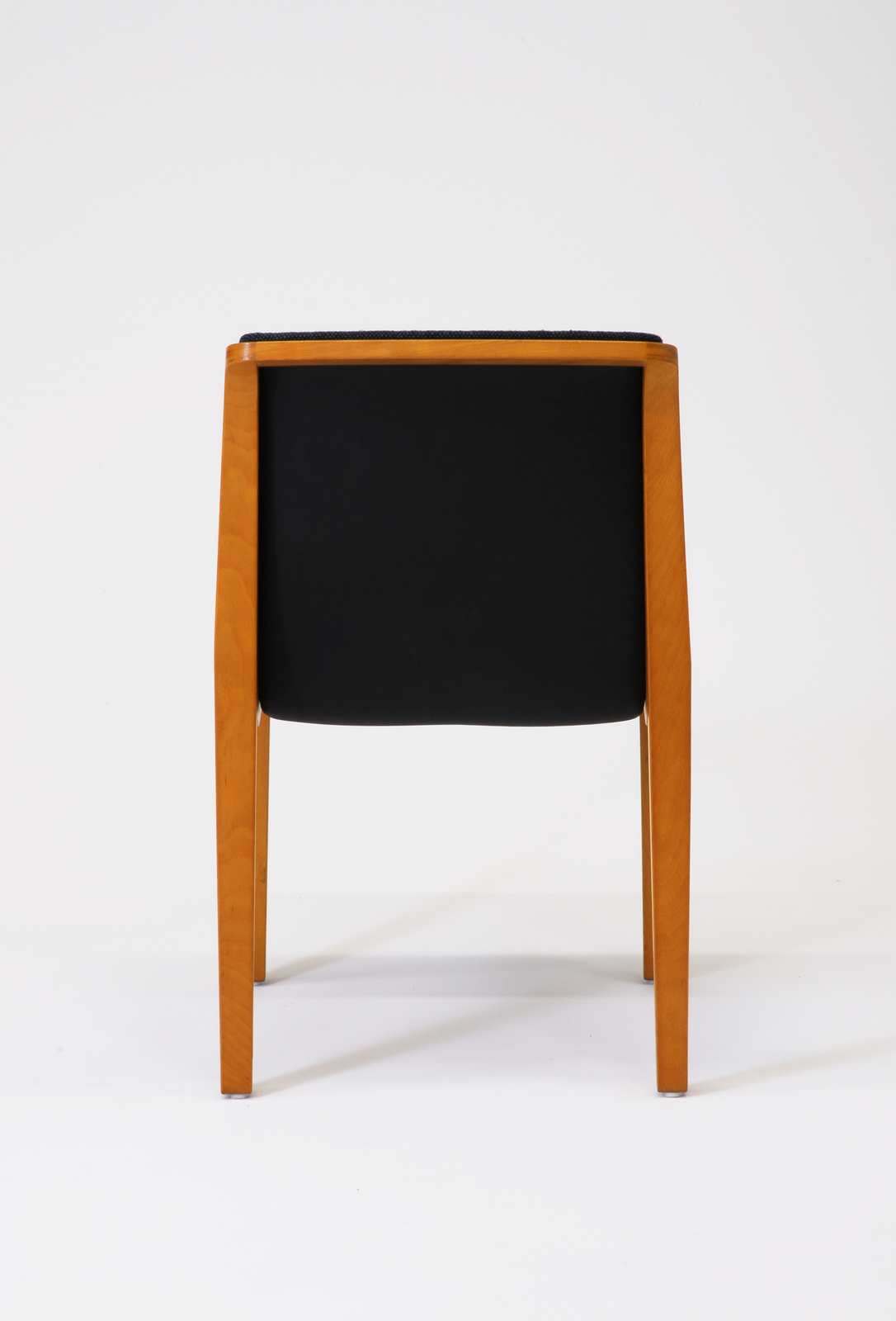 成形合板によって側面のフレームが構成されていて 背は前脚からつながる部分と後脚からつながる部分が合流するようなかたちで接合されている。脚は場所によって厚さの異なる不等厚の成形合板でくつくられている。そのため貫がなくても強い構造になっていて、しかも脚元がすっきりしたデザインとなっている。 |