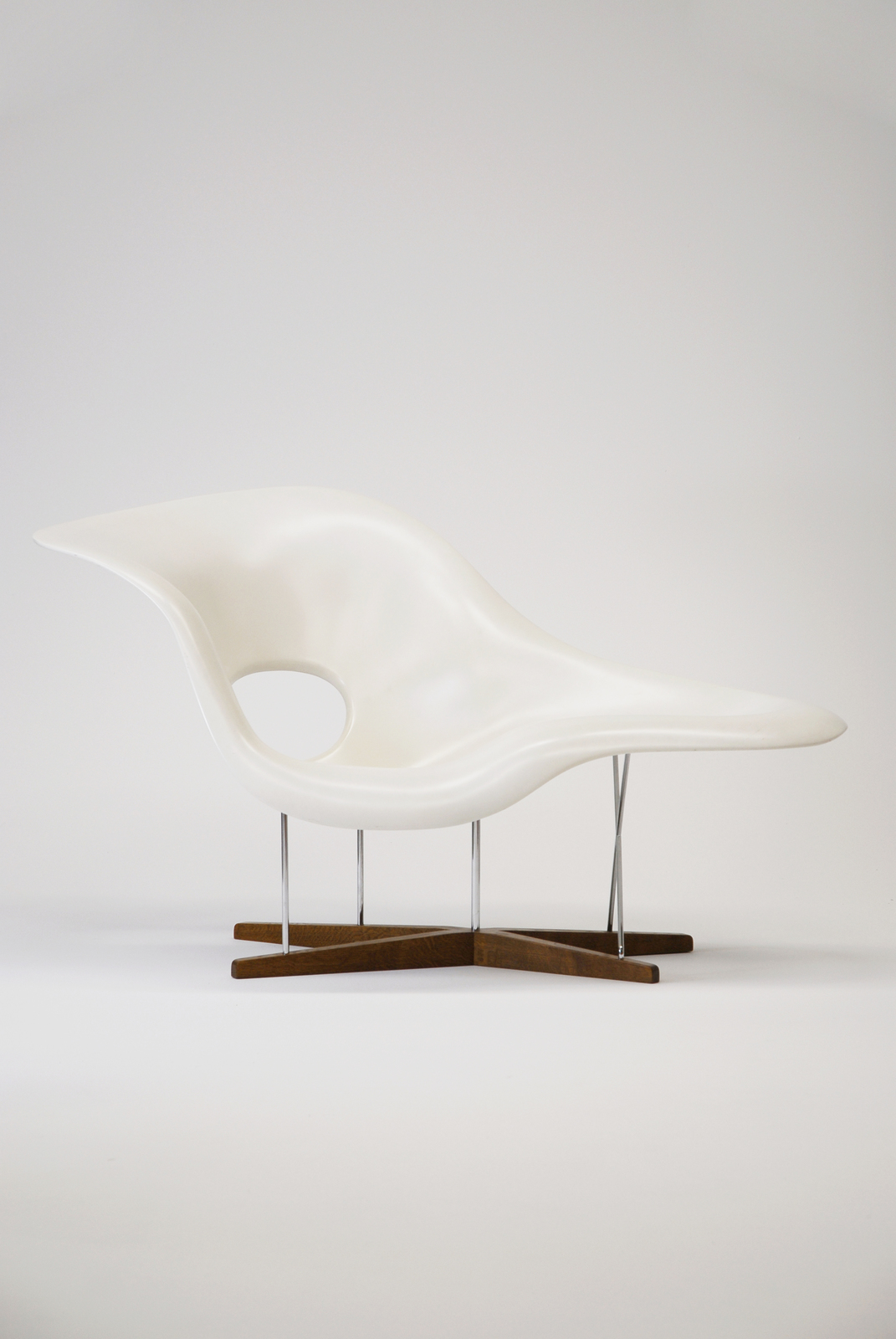 イームズ夫妻は、この椅子が彫刻家ガストン・ラシェーズによる作品「浮かぶ姿」とよく調和するということでこの名をつけた。1948年に「ローコスト家具デザインコンペ」のためにデザインされたものであるが、当時の技術ではまだ生産されず、製造され始めたのは1990年からのことである。FRPによる造形の可能性をいわば、椅子という場で彫刻的に展開したものと言えるかもしれない。金属の脚でFRP部分を支えていることで、空を飛ぶ雲のような軽快な印象を与えるが、このFRPと鉄棒と木材という素材の融合は、ミッドセンチュリーの時期に流行した組み合わせである。 |