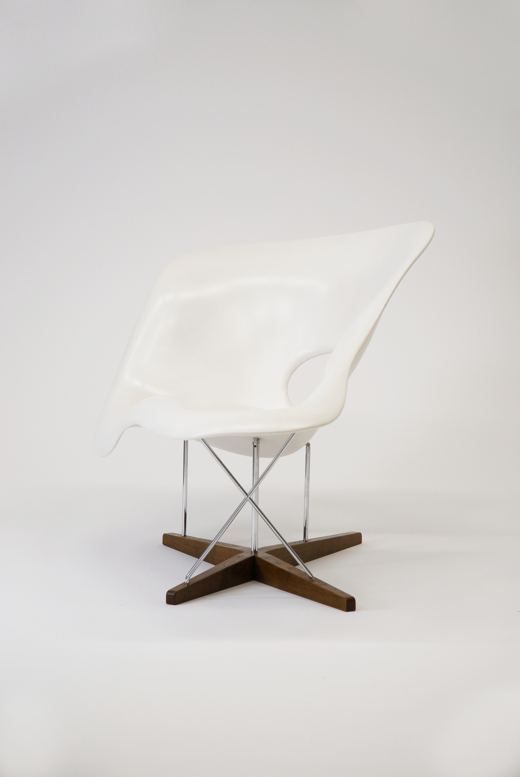 イームズ夫妻は、この椅子が彫刻家ガストン・ラシェーズによる作品「浮かぶ姿」とよく調和するということでこの名をつけた。1948年に「ローコスト家具デザインコンペ」のためにデザインされたものであるが、当時の技術ではまだ生産されず、製造され始めたのは1990年からのことである。FRPによる造形の可能性をいわば、椅子という場で彫刻的に展開したものと言えるかもしれない。金属の脚でFRP部分を支えていることで、空を飛ぶ雲のような軽快な印象を与えるが、このFRPと鉄棒と木材という素材の融合は、ミッドセンチュリーの時期に流行した組み合わせである。 |