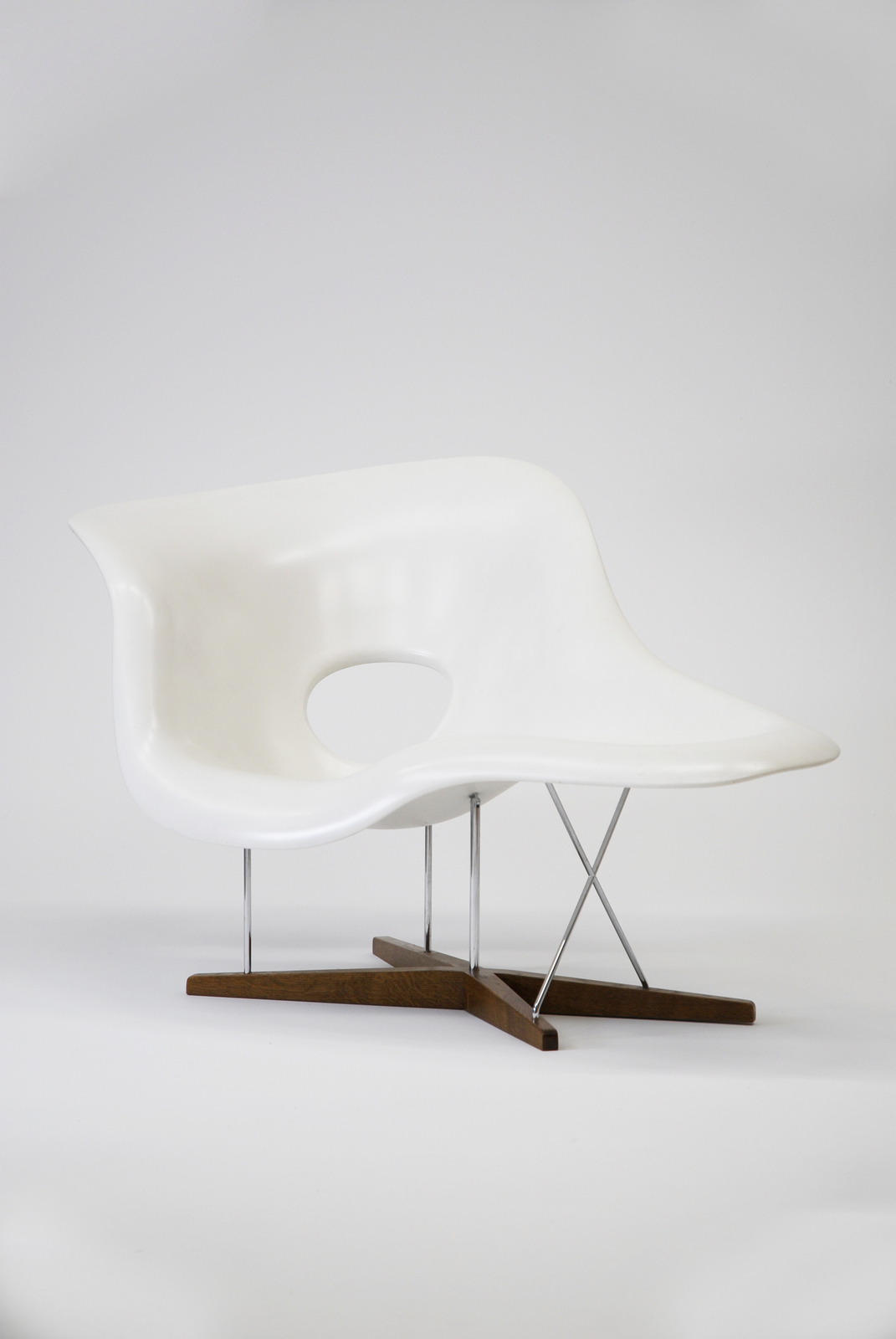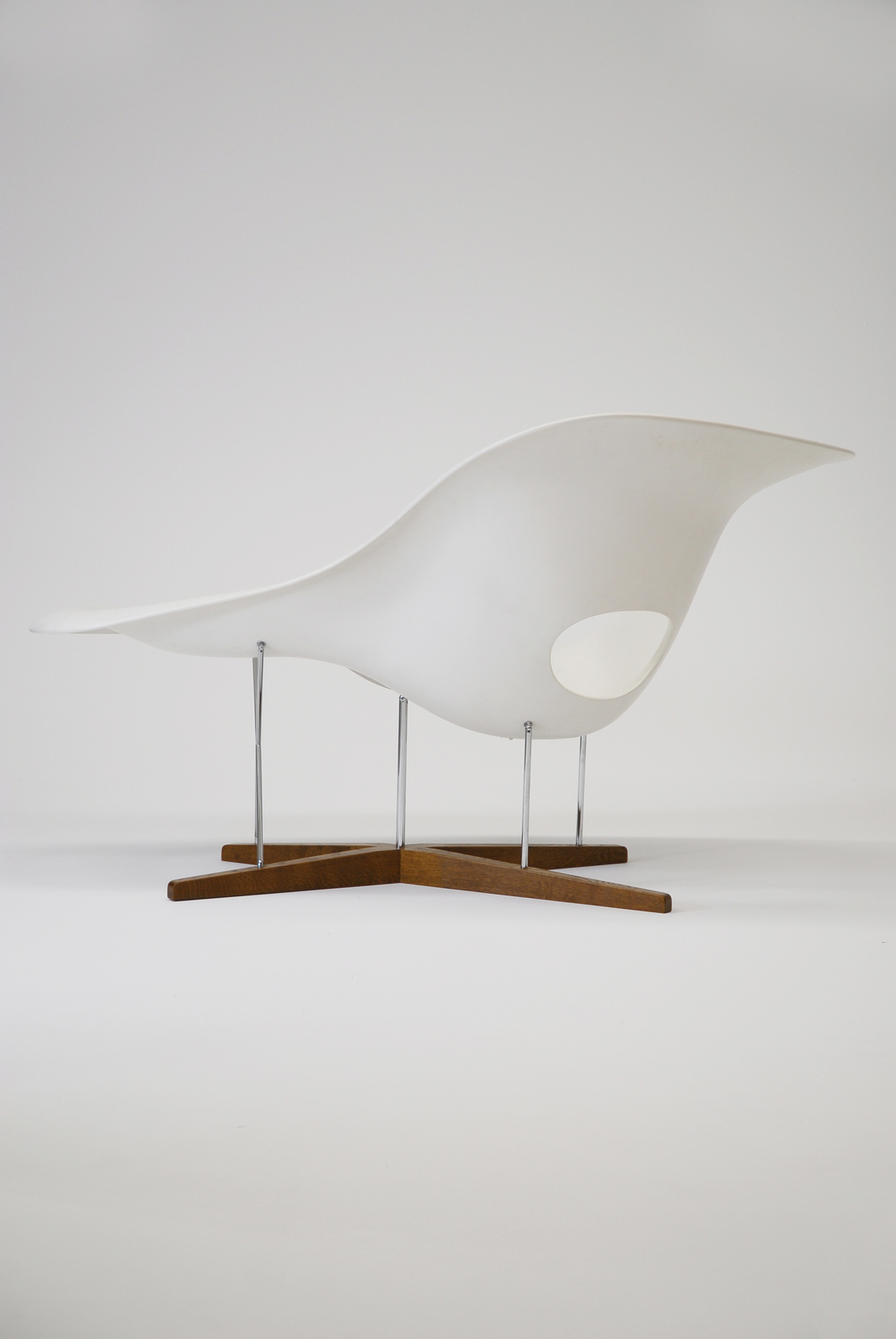 イームズ夫妻は、この椅子が彫刻家ガストン・ラシェーズによる作品「浮かぶ姿」とよく調和するということでこの名をつけた。1948年に「ローコスト家具デザインコンペ」のためにデザインされたものであるが、当時の技術ではまだ生産されず、製造され始めたのは1990年からのことである。FRPによる造形の可能性をいわば、椅子という場で彫刻的に展開したものと言えるかもしれない。金属の脚でFRP部分を支えていることで、空を飛ぶ雲のような軽快な印象を与えるが、このFRPと鉄棒と木材という素材の融合は、ミッドセンチュリーの時期に流行した組み合わせである。 |