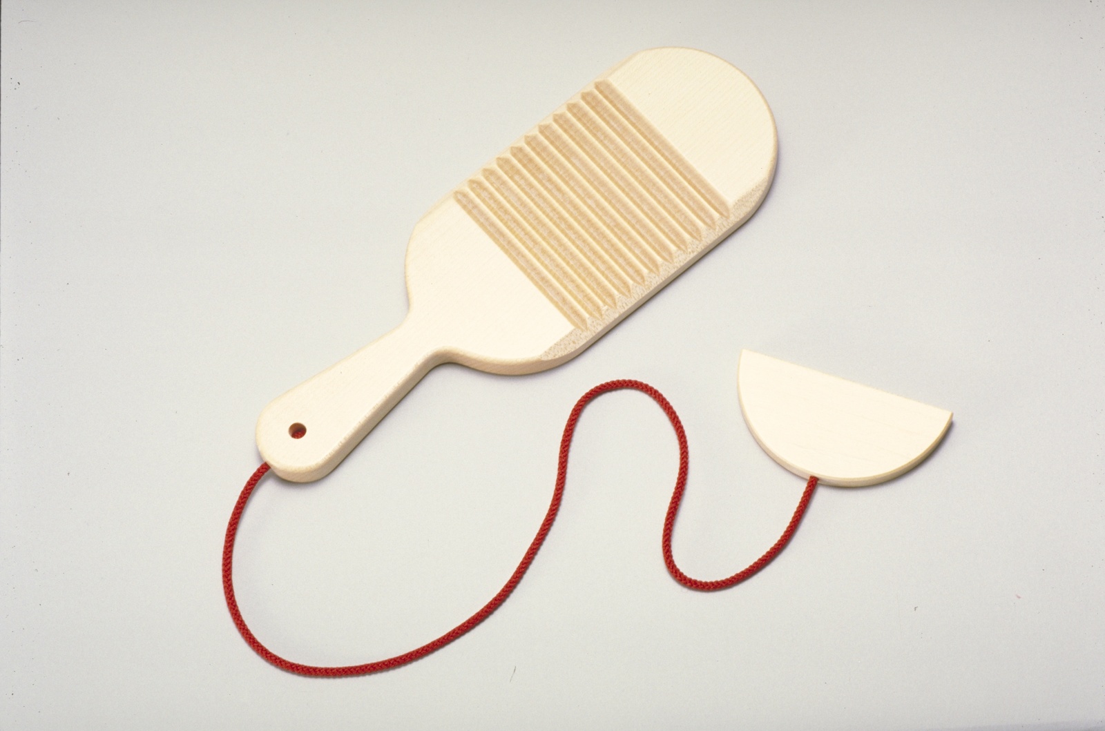 ジャズの楽器を模してつくたれたおもちゃ。ギザギザの部分を半円の板でこすり、音をたてて遊ぶ。適応年齢:4+ |