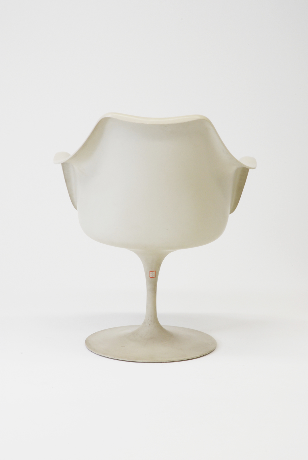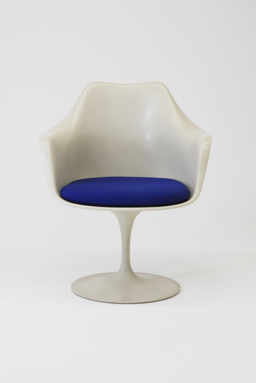 サーリネンは有機的なフォルムの造形を追求するあまり、何とかして脚の本数を減らしたいと考えた。この椅子は座と背、アーム全て一体化したFRPでできている。脚もFRPと同じ表面仕上がりになっているが、座面裏の境目以下はアルミダイキャスト製で、焼き付け塗装のマットな仕上がりになっている。座のクッション部分の下が大きいため、アルミダイキャストの床に接する部分を円盤状にして安定性を高めている。クッションはブライトな色が使われていて、面ファスナーによって取りつけられている。