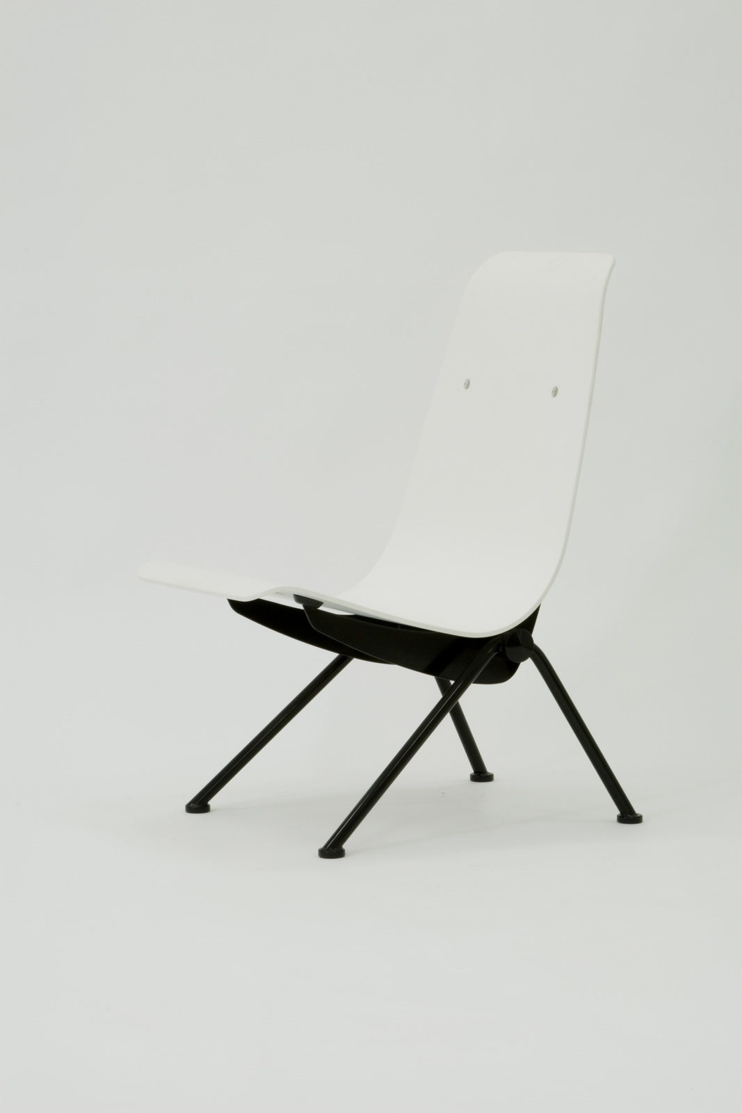 ストラスブール大学のためにデザインされた椅子。座面から背にかけての曲面は成型合板によるもので、これを三日月型のスチールリブで浮かせるようにして支えることで優雅なラインを演出している。また脚部の逆V字型は、安定性を確保しつつ可能な限り削ぎ落としたフォルムである。
