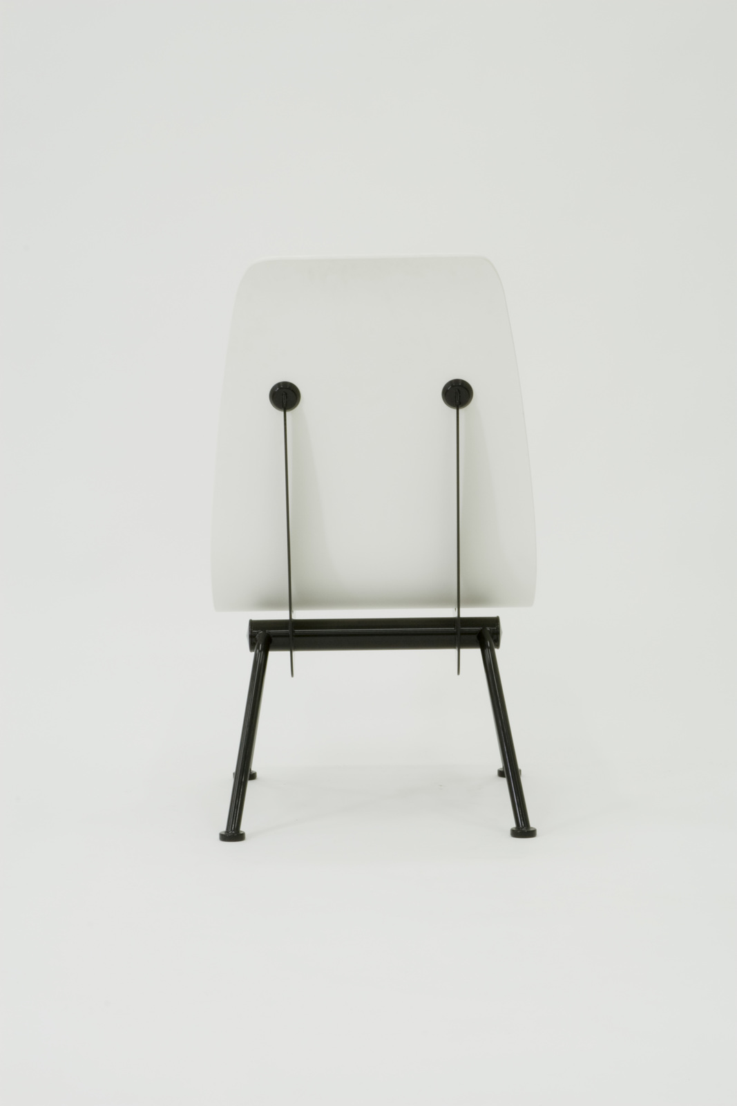 ストラスブール大学のためにデザインされた椅子。座面から背にかけての曲面は成型合板によるもので、これを三日月型のスチールリブで浮かせるようにして支えることで優雅なラインを演出している。また脚部の逆V字型は、安定性を確保しつつ可能な限り削ぎ落としたフォルムである。