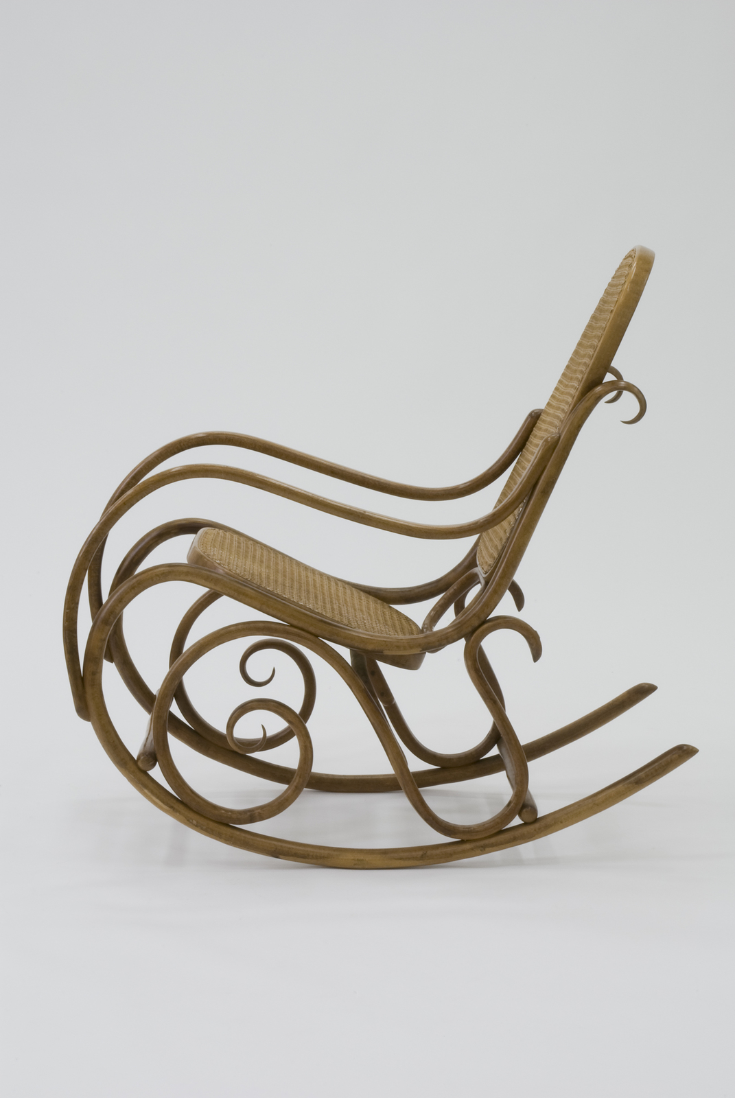 No.14等の一連のトーネット作品のひとつ。曲木によるロッキングチェアである。側面から見た部品の形状はアールヌーヴォー期らしい美しく優雅な曲線を描いている。いずれのカーブも合理的な曲げるという技術の過程で生まれたものである。それがたまたま時代(アールヌーボー)の装飾的効果を生んでいた。装飾的でありながら1つ1つの部品は量産性や運搬性のことが考えられている。接合はボルトナットによる組立式で、合理的な構造となっている。座と背は手編みによる籐張りになっており、当時としてはごく当たり前の加工法であった。 |