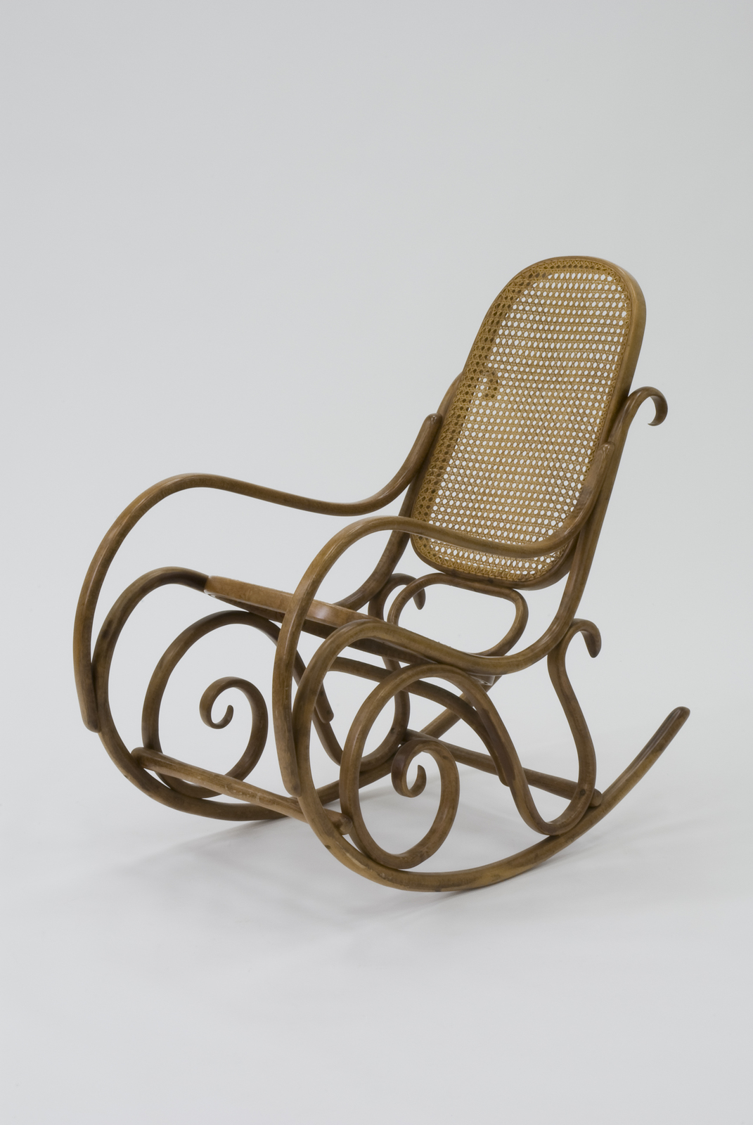 No.14等の一連のトーネット作品のひとつ。曲木によるロッキングチェアである。側面から見た部品の形状はアールヌーヴォー期らしい美しく優雅な曲線を描いている。いずれのカーブも合理的な曲げるという技術の過程で生まれたものである。それがたまたま時代(アールヌーボー)の装飾的効果を生んでいた。装飾的でありながら1つ1つの部品は量産性や運搬性のことが考えられている。接合はボルトナットによる組立式で、合理的な構造となっている。座と背は手編みによる籐張りになっており、当時としてはごく当たり前の加工法であった。 |