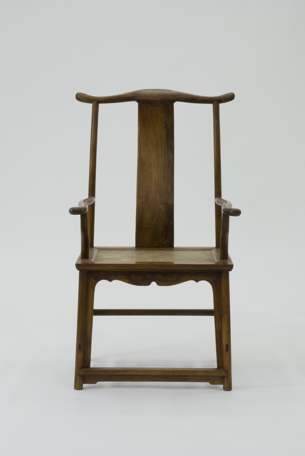 明式家具に伝わる代表的なフォルムのひとつである。その最大の特徴は、上方に伸びる後脚と笠木が出会う部分が牛車などで使われる「くびき」をかたどっていることだろう。横に張り出した笠木が両端にいくほど太くなっているのは、安定感とともに威圧感を与える。この椅子が明以前の唐や宋の時代に、権力者の椅子として使われていたためであろう。背はセミハイバックの高さであり、ちょうど首の根本が笠木の滑らかな曲線で支えられるつくりとなっている。 |