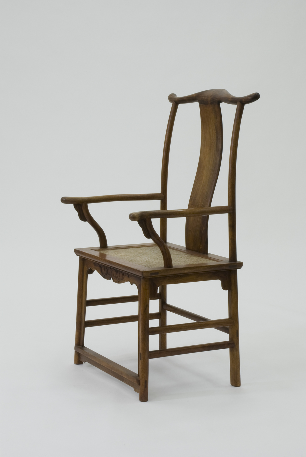 明式家具に伝わる代表的なフォルムのひとつである。その最大の特徴は、上方に伸びる後脚と笠木が出会う部分が牛車などで使われる「くびき」をかたどっていることだろう。横に張り出した笠木が両端にいくほど太くなっているのは、安定感とともに威圧感を与える。この椅子が明以前の唐や宋の時代に、権力者の椅子として使われていたためであろう。背はセミハイバックの高さであり、ちょうど首の根本が笠木の滑らかな曲線で支えられるつくりとなっている。 |