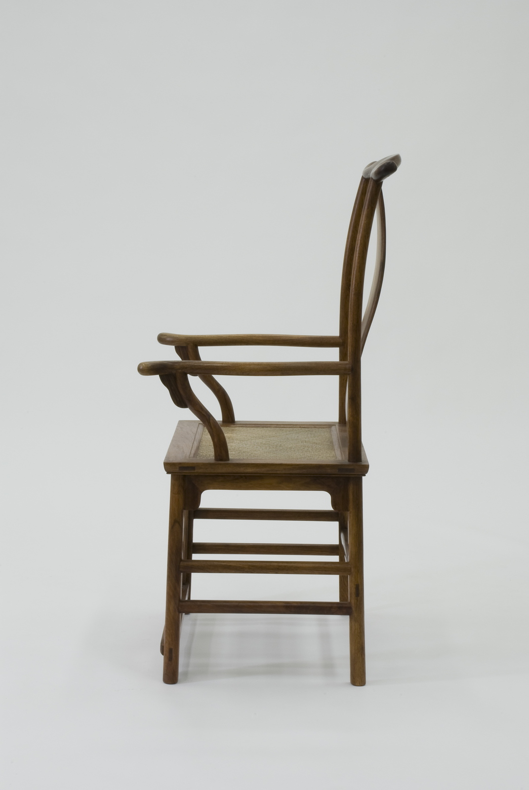 明式家具に伝わる代表的なフォルムのひとつである。その最大の特徴は、上方に伸びる後脚と笠木が出会う部分が牛車などで使われる「くびき」をかたどっていることだろう。横に張り出した笠木が両端にいくほど太くなっているのは、安定感とともに威圧感を与える。この椅子が明以前の唐や宋の時代に、権力者の椅子として使われていたためであろう。背はセミハイバックの高さであり、ちょうど首の根本が笠木の滑らかな曲線で支えられるつくりとなっている。 |