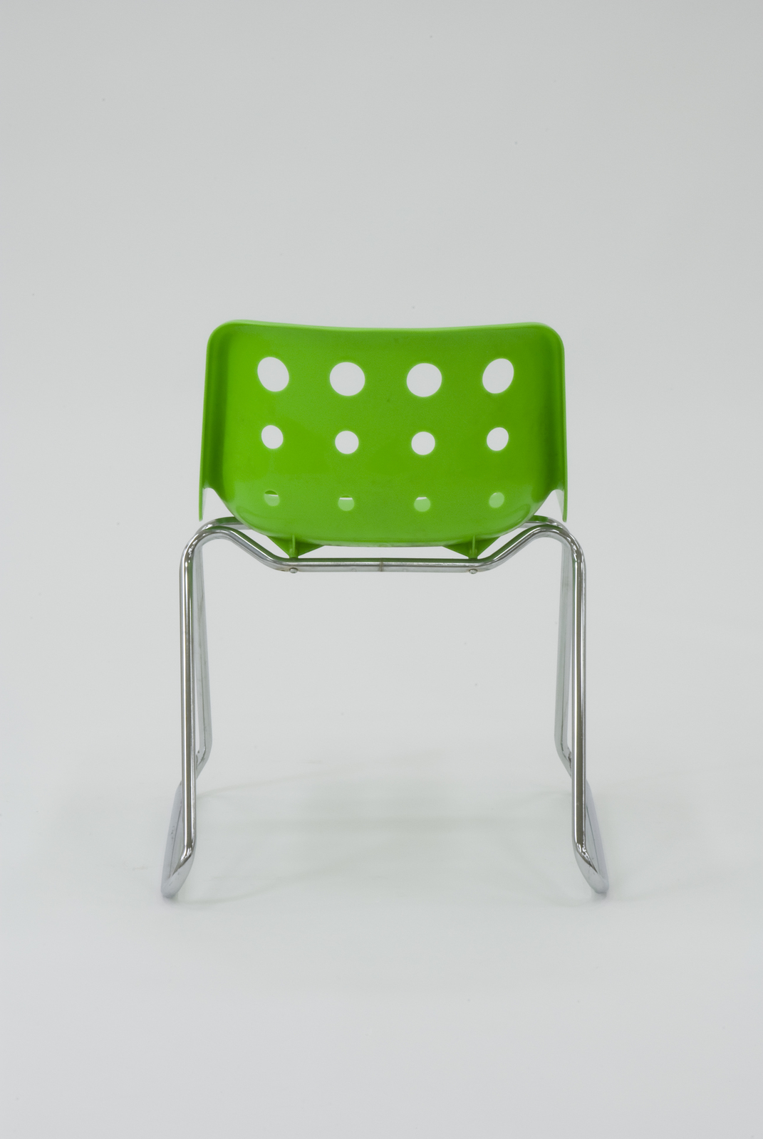 背と座に開いた大小の穴とクローム仕上げのスレッジベースの特徴あるデザインで、スタッキングが可能になっている。材質はシェル部分がポリプロピレン、脚部はスチールのクローム仕上げとなっている。