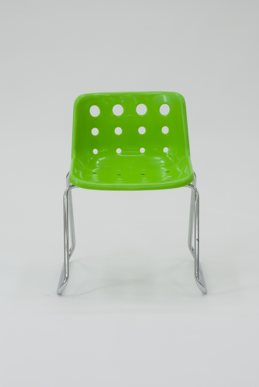 背と座に開いた大小の穴とクローム仕上げのスレッジベースの特徴あるデザインで、スタッキングが可能になっている。材質はシェル部分がポリプロピレン、脚部はスチールのクローム仕上げとなっている。