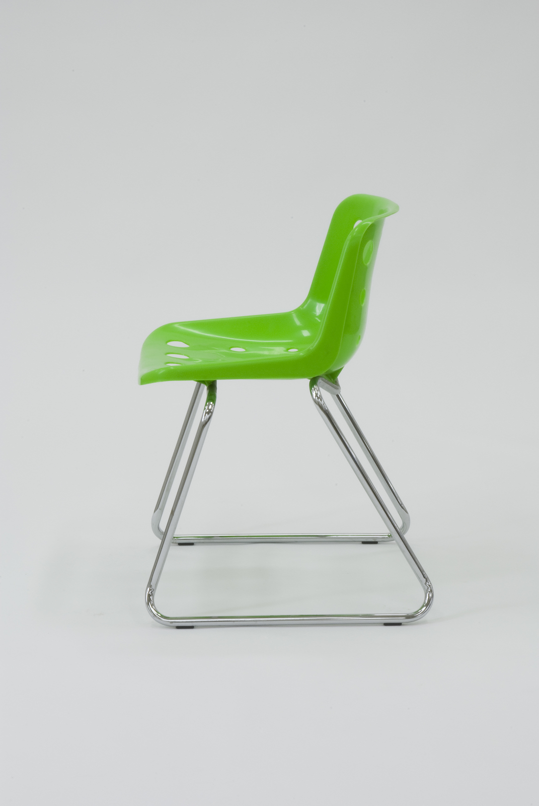 背と座に開いた大小の穴とクローム仕上げのスレッジベースの特徴あるデザインで、スタッキングが可能になっている。材質はシェル部分がポリプロピレン、脚部はスチールのクローム仕上げとなっている。
