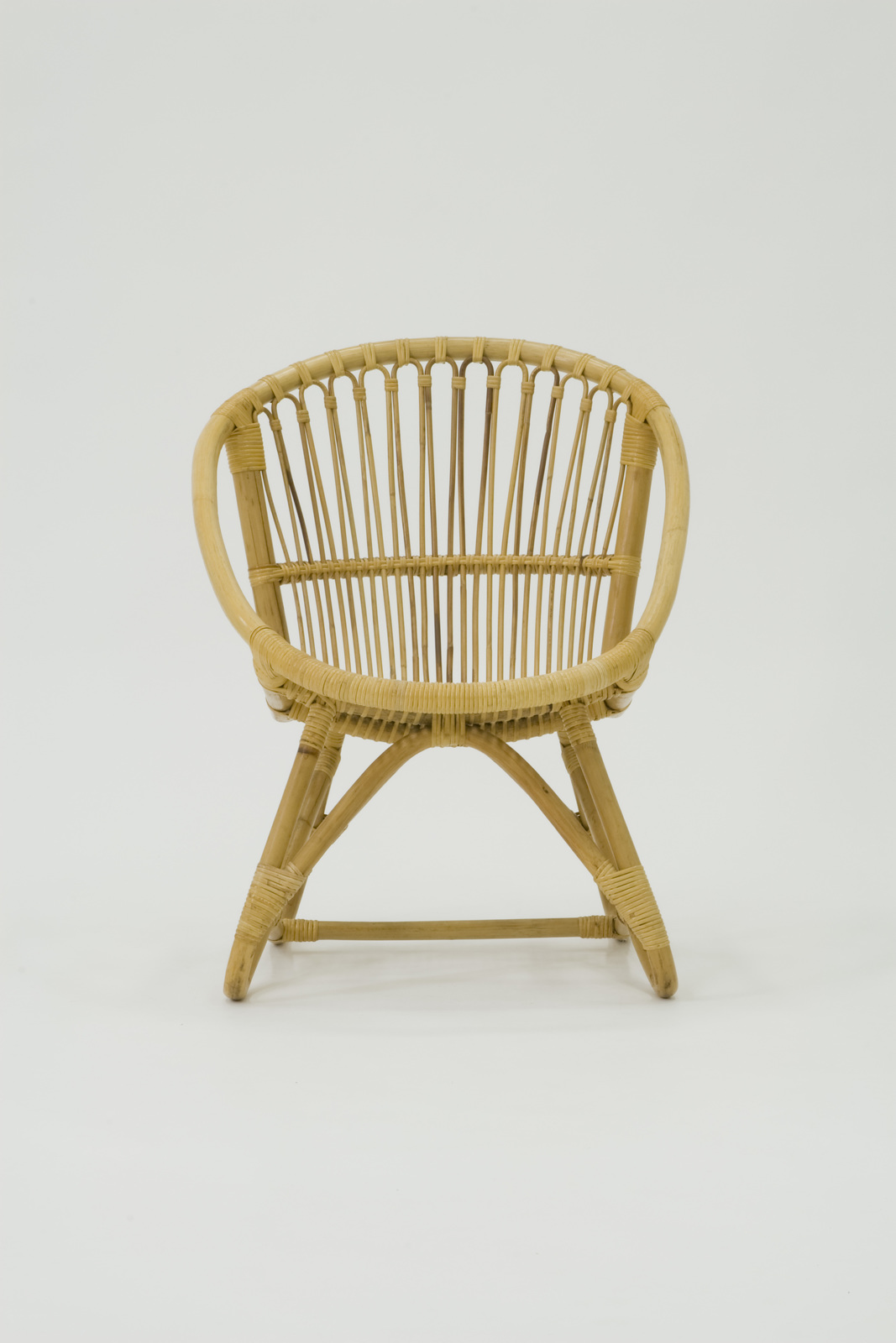 高温多湿の日本の気候風土を意識し、東南アジアのラタンを使用し、東洋的なフォルムを持った椅子である。構造材は太民籐(直径が30 前後のもの)を3次曲線に曲げて加工し座と背はそれより細い細民籐(直径が7 前後のもの)を使用している。籐家具は素材の性質上合理的に貫などの補強材を入れなければならないが、この椅子はその貫などが形態の中で違和感なく構成されている。日本人の体格と空間に合うようこじんまりと巧みにまとまっている。日本の代表的な籐家具メーカーである山川ラタンの製品。このメーカーは剣持勇のラウンジチェアや渡辺力のトリイスツール等名作椅子を多数製作している。 |