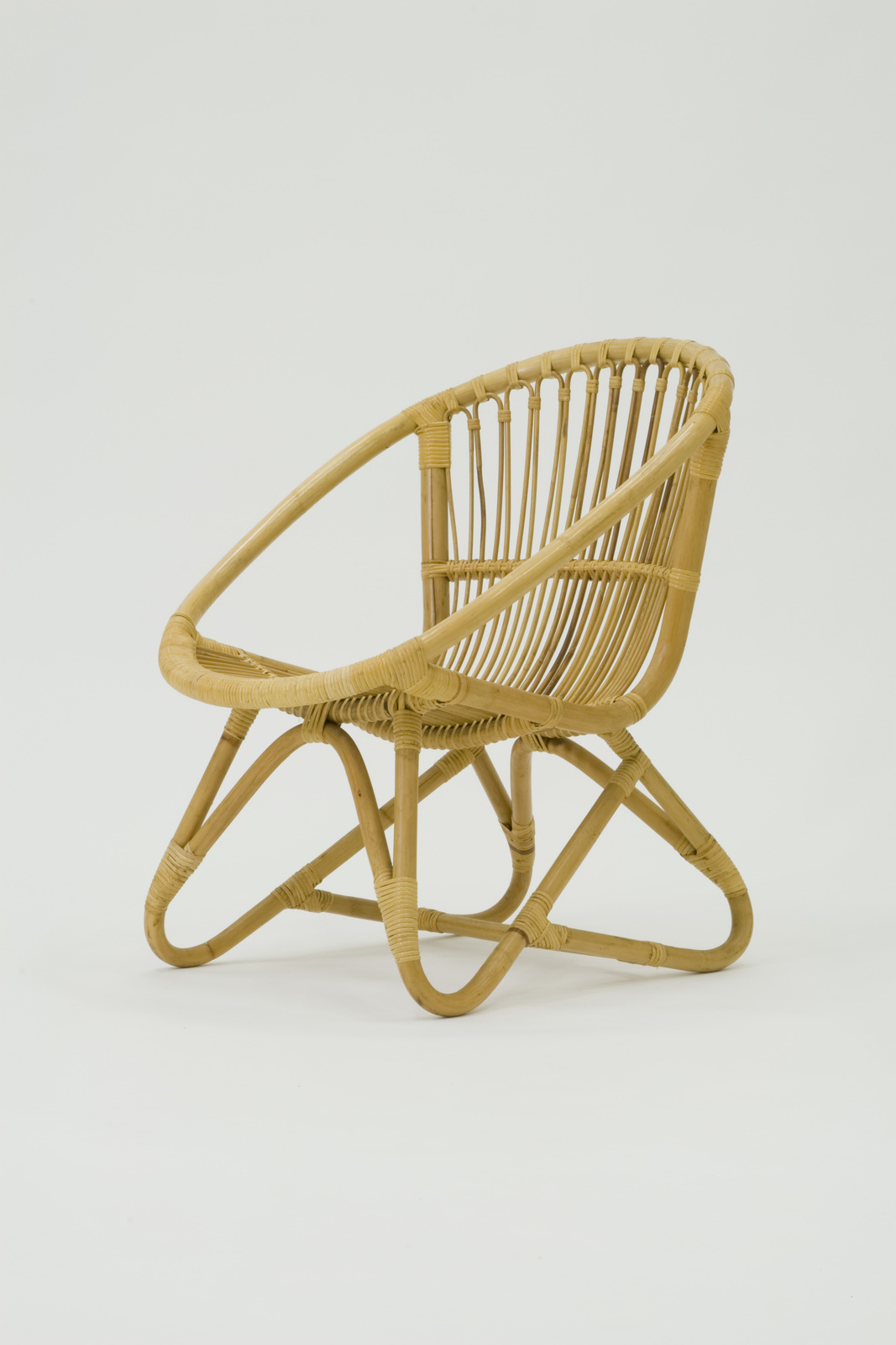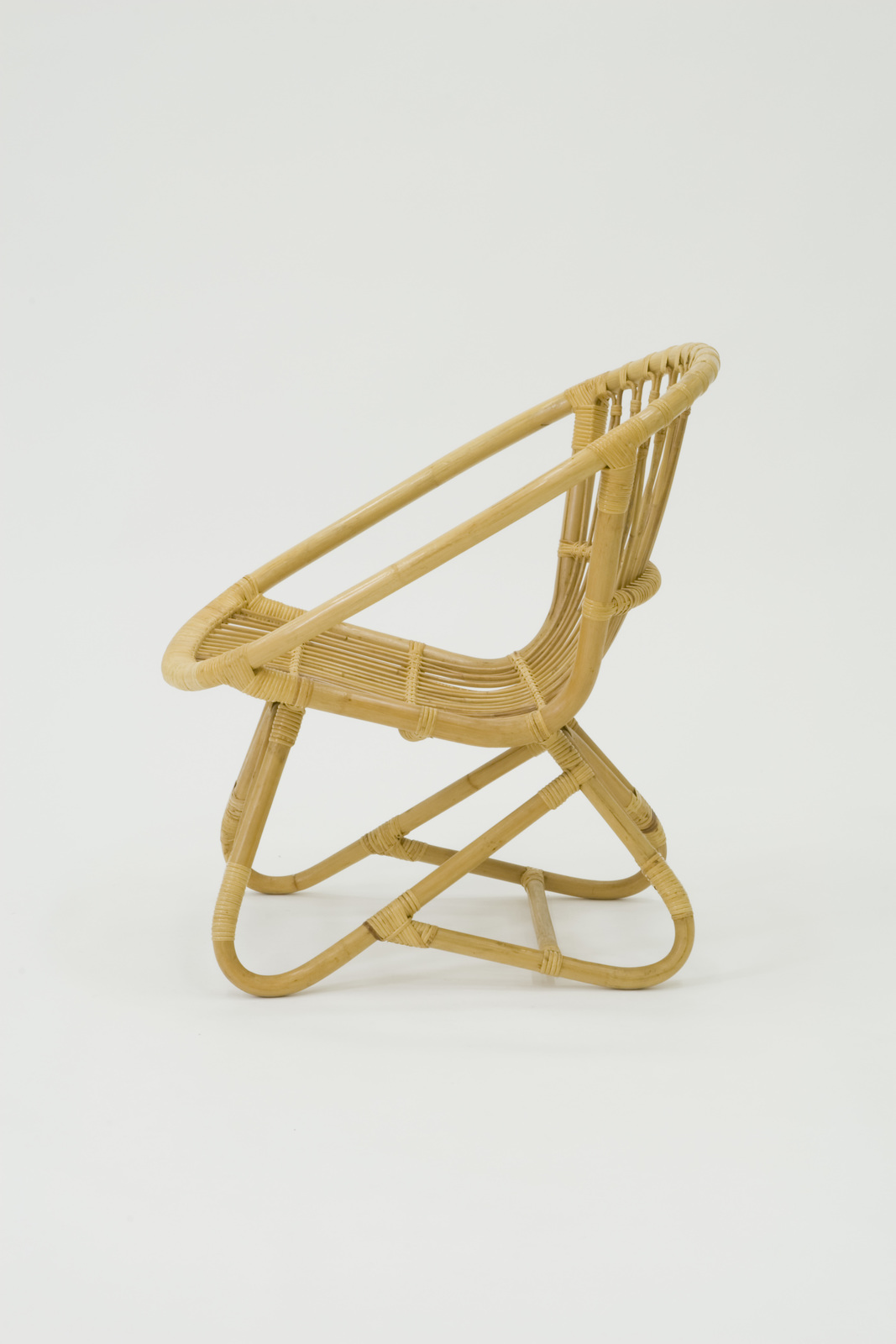 高温多湿の日本の気候風土を意識し、東南アジアのラタンを使用し、東洋的なフォルムを持った椅子である。構造材は太民籐(直径が30 前後のもの)を3次曲線に曲げて加工し座と背はそれより細い細民籐(直径が7 前後のもの)を使用している。籐家具は素材の性質上合理的に貫などの補強材を入れなければならないが、この椅子はその貫などが形態の中で違和感なく構成されている。日本人の体格と空間に合うようこじんまりと巧みにまとまっている。日本の代表的な籐家具メーカーである山川ラタンの製品。このメーカーは剣持勇のラウンジチェアや渡辺力のトリイスツール等名作椅子を多数製作している。 |