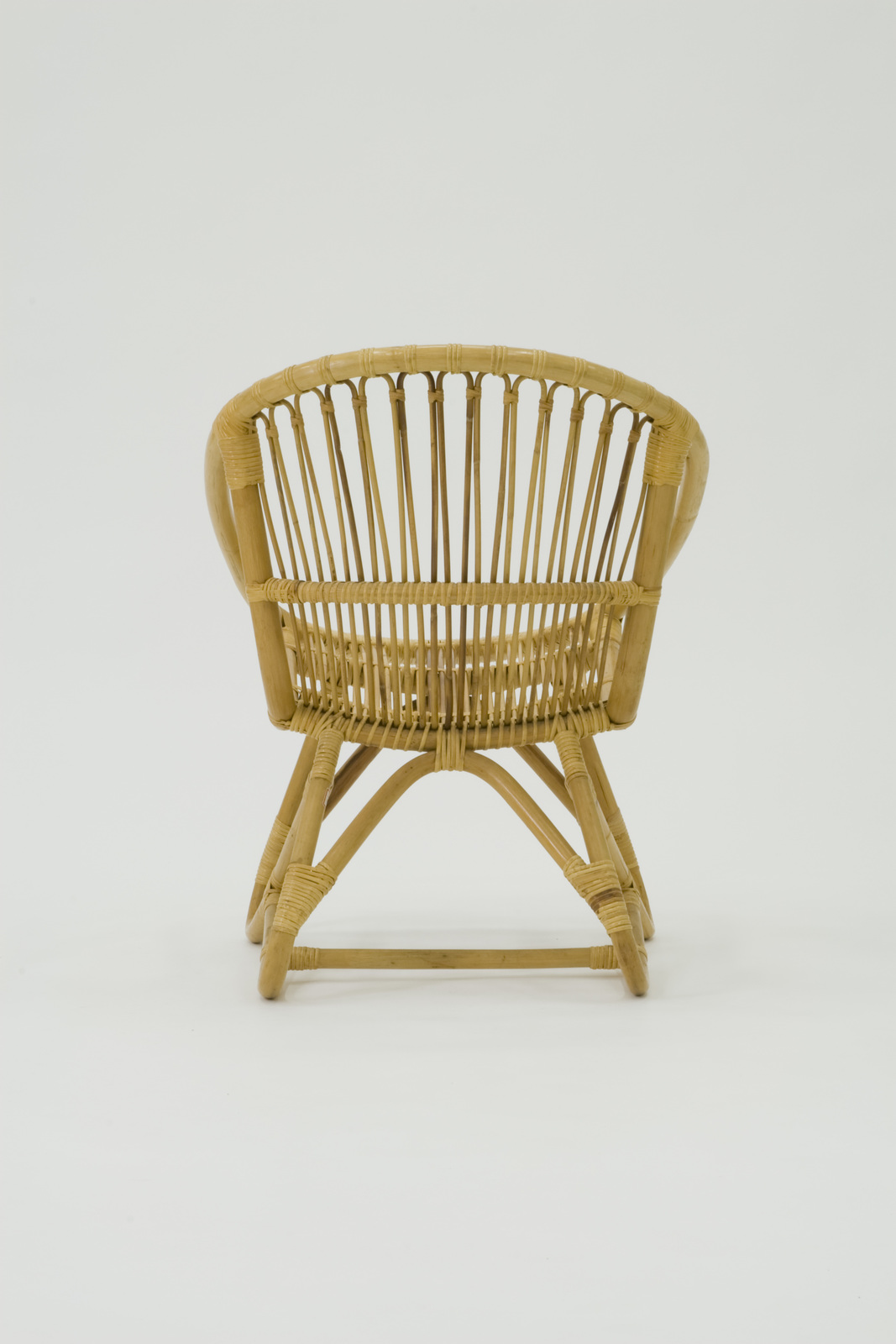 高温多湿の日本の気候風土を意識し、東南アジアのラタンを使用し、東洋的なフォルムを持った椅子である。構造材は太民籐(直径が30 前後のもの)を3次曲線に曲げて加工し座と背はそれより細い細民籐(直径が7 前後のもの)を使用している。籐家具は素材の性質上合理的に貫などの補強材を入れなければならないが、この椅子はその貫などが形態の中で違和感なく構成されている。日本人の体格と空間に合うようこじんまりと巧みにまとまっている。日本の代表的な籐家具メーカーである山川ラタンの製品。このメーカーは剣持勇のラウンジチェアや渡辺力のトリイスツール等名作椅子を多数製作している。 |