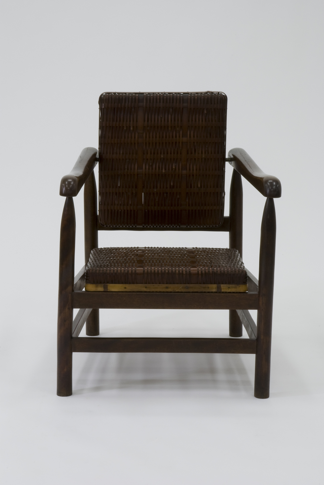 木のフレームに対して、座と背は竹籠あみの技術を用いた角型のクッションでできている。背の左右に軸がついていて、ある程度回転し、座ったとき背もたれの角度が自由になるつくりになっている。座と背の表面に張ってある竹の皮は、用いる箇所によって幅を変える工夫がなされていて、その模様が大変美しい。内部フレームは台輪状の木枠が回っていてしっかりしている。同じ素材、構造でつくられたオットマンがある。日本的な素材の美しさが感じられる。日本の代表的な建築家である坂倉準三は若くしてル・コルビジェのアトリエで働き、シャルロット・ペリアンとも親交を重ねた。静岡の籠製作者の協力を得て、試作されたものである。 |