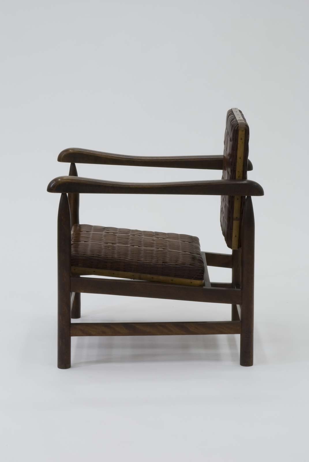 木のフレームに対して、座と背は竹籠あみの技術を用いた角型のクッションでできている。背の左右に軸がついていて、ある程度回転し、座ったとき背もたれの角度が自由になるつくりになっている。座と背の表面に張ってある竹の皮は、用いる箇所によって幅を変える工夫がなされていて、その模様が大変美しい。内部フレームは台輪状の木枠が回っていてしっかりしている。同じ素材、構造でつくられたオットマンがある。日本的な素材の美しさが感じられる。日本の代表的な建築家である坂倉準三は若くしてル・コルビジェのアトリエで働き、シャルロット・ペリアンとも親交を重ねた。静岡の籠製作者の協力を得て、試作されたものである。 |