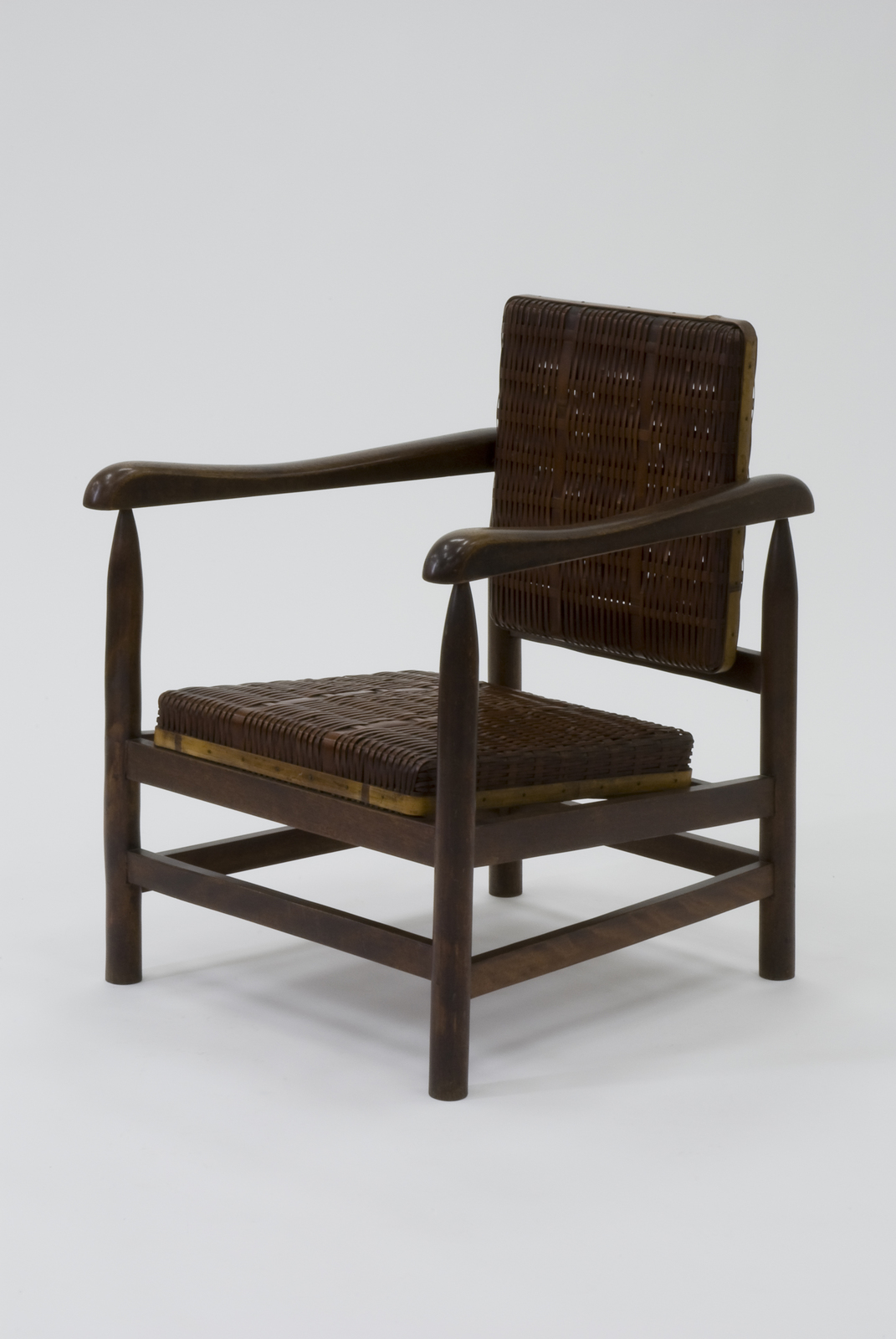 木のフレームに対して、座と背は竹籠あみの技術を用いた角型のクッションでできている。背の左右に軸がついていて、ある程度回転し、座ったとき背もたれの角度が自由になるつくりになっている。座と背の表面に張ってある竹の皮は、用いる箇所によって幅を変える工夫がなされていて、その模様が大変美しい。内部フレームは台輪状の木枠が回っていてしっかりしている。同じ素材、構造でつくられたオットマンがある。日本的な素材の美しさが感じられる。日本の代表的な建築家である坂倉準三は若くしてル・コルビジェのアトリエで働き、シャルロット・ペリアンとも親交を重ねた。静岡の籠製作者の協力を得て、試作されたものである。 |