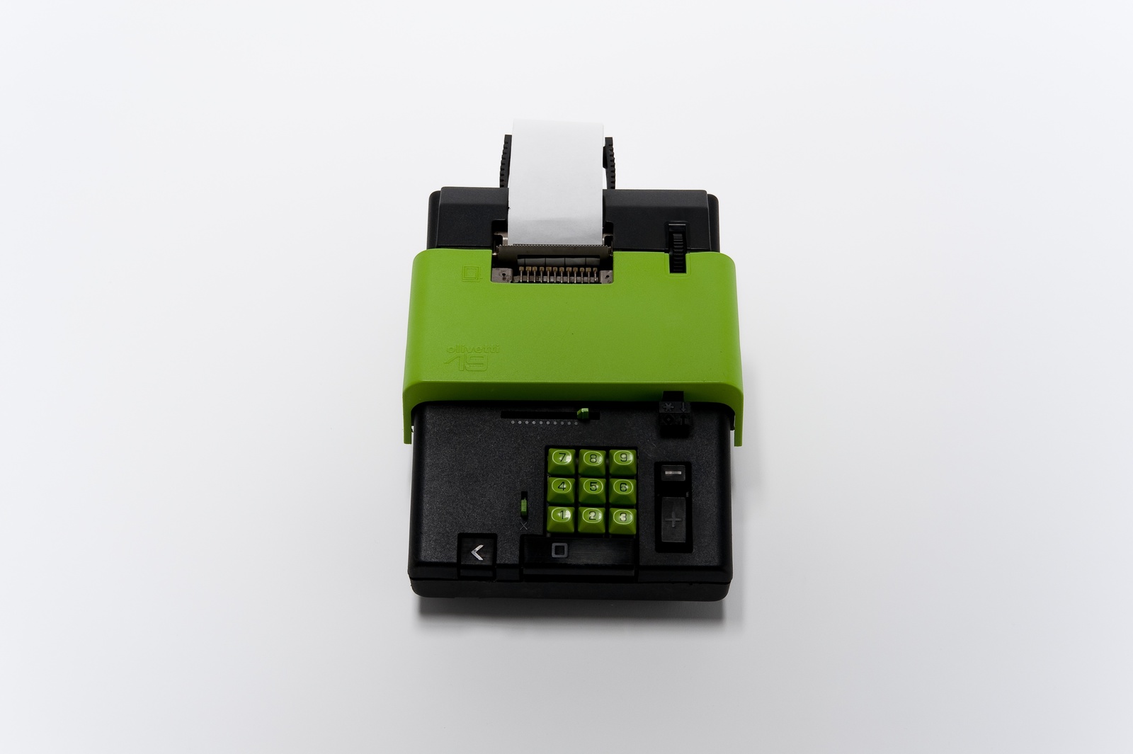 タイプライターに続き、オリベッティ社は計算機と加算機の製造に着手した。後年になるとオリベッティ社はコンピューターなど情報処理機器の製造が主力事業となるが、その根幹にあるのが計算機や加算機である。タイプライターの開発で蓄積された技術を活用し、高い性能と美しさを兼ね備えた製品を次々と発表した。機械による印字と計算という分野で、オリベッティ社は他の追随を許さず、企業として大きく発展を遂げることになる。 まるでおもちゃのような外観の加算器「スンマ19」はボディがすべてプラスチックで作られているため非常に軽く、低価格での販売も可能となった。機構部を覆う黄緑色のカバーと黒地のボディのコントラストが鮮烈な印象を与え、伊坂芳太郎がデザインしたポスターにもそのカラーリングに驚く人々の様子が描かれている。 |