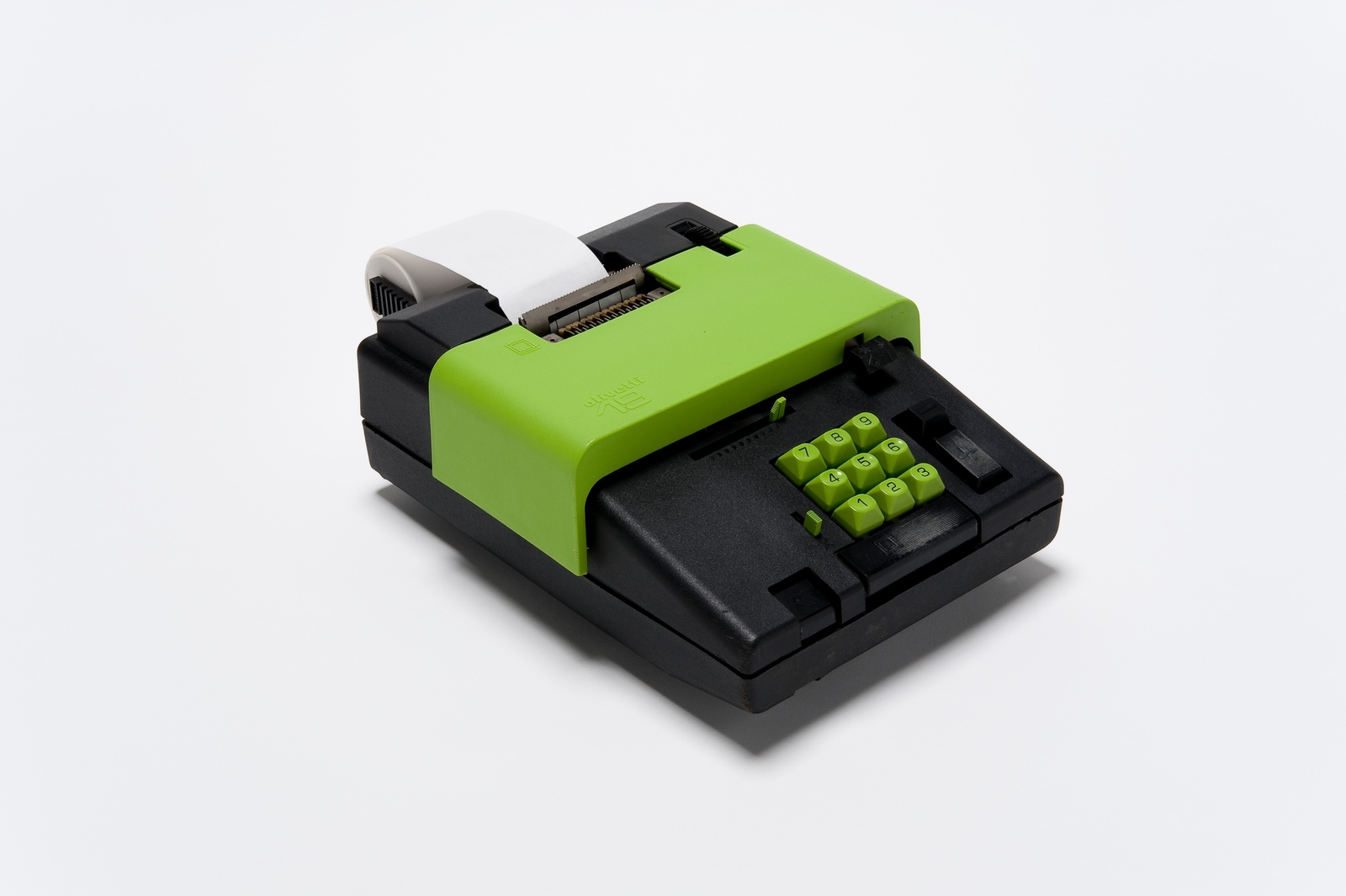 タイプライターに続き、オリベッティ社は計算機と加算機の製造に着手した。後年になるとオリベッティ社はコンピューターなど情報処理機器の製造が主力事業となるが、その根幹にあるのが計算機や加算機である。タイプライターの開発で蓄積された技術を活用し、高い性能と美しさを兼ね備えた製品を次々と発表した。機械による印字と計算という分野で、オリベッティ社は他の追随を許さず、企業として大きく発展を遂げることになる。 まるでおもちゃのような外観の加算器「スンマ19」はボディがすべてプラスチックで作られているため非常に軽く、低価格での販売も可能となった。機構部を覆う黄緑色のカバーと黒地のボディのコントラストが鮮烈な印象を与え、伊坂芳太郎がデザインしたポスターにもそのカラーリングに驚く人々の様子が描かれている。 |