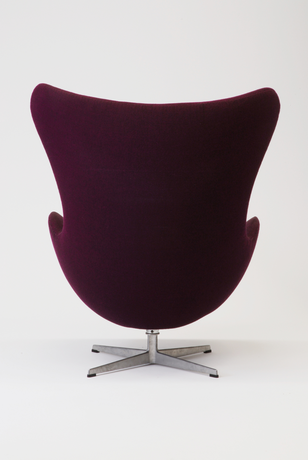 後方から見たシルエットから、エッグ(卵)の名がつけられた。ホテルのロビー用につくられた椅子であり、1つのテーブルを囲んで、他の人たちとは隔離された空間をつくるために考えられた形である。つまりハイバックにし、体を囲むことがコンセプトである。ロビーだけでなく他の空間でも使用され、量産できるように硬質発砲樹脂が使われている。この椅子はゆったりしており、背に寄り掛かるとリクライニングするが、4本脚でも十分安定している。この椅子は新しい素材と、新しい製法でつくられているため発売当初は奇抜な存在だった。 |
