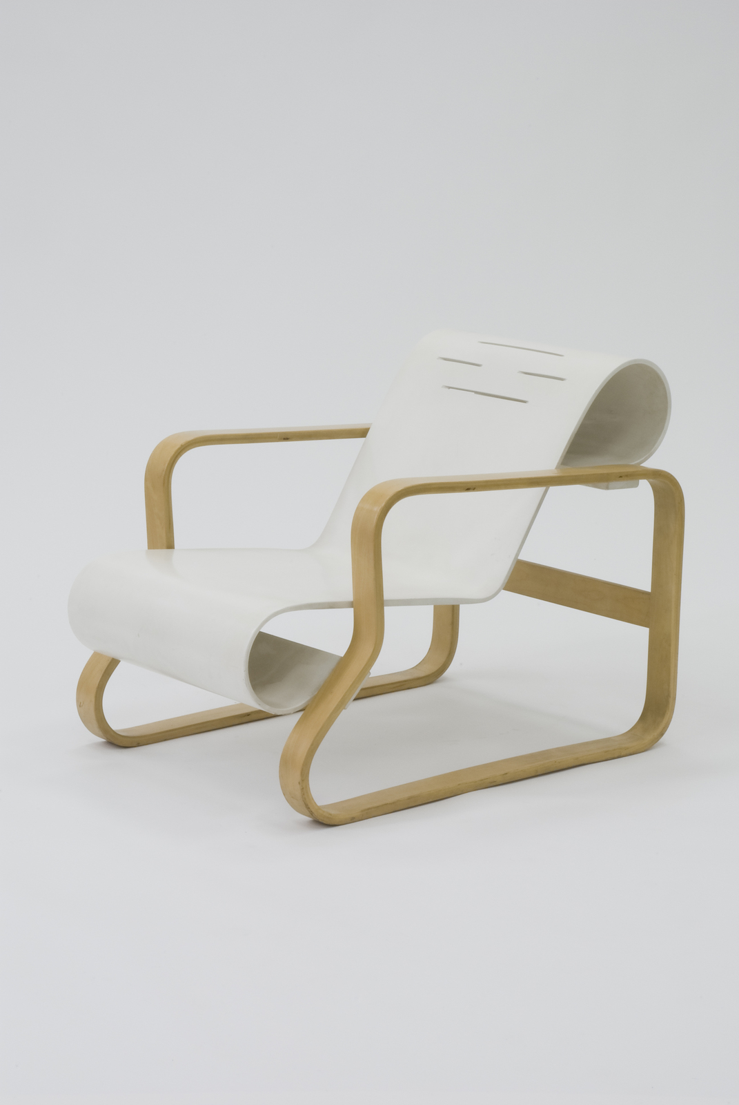 当時フィンランド建築界の新鋭アアルトがパイミオにあるサナトリウムの設計コンペを勝ちとった際に、その建築とともにデザインした椅子である。フィンランドによくある白樺の木を使い、「森と湖」をテーマにしたともいえる優雅な曲線で表現されている。一枚の成形合板で背と座がつくられているので弾力性があるように見えるが、その座り心地はそれ程良いとは言えない。背には4本の切れ目が入っているが、これでアクセントを兼ねながら強度を保たせている。そしてアームから切れ目なく続く前後の脚は、日本の「畳擦り」のようにカーペットを傷ためないようにつくられている。 |