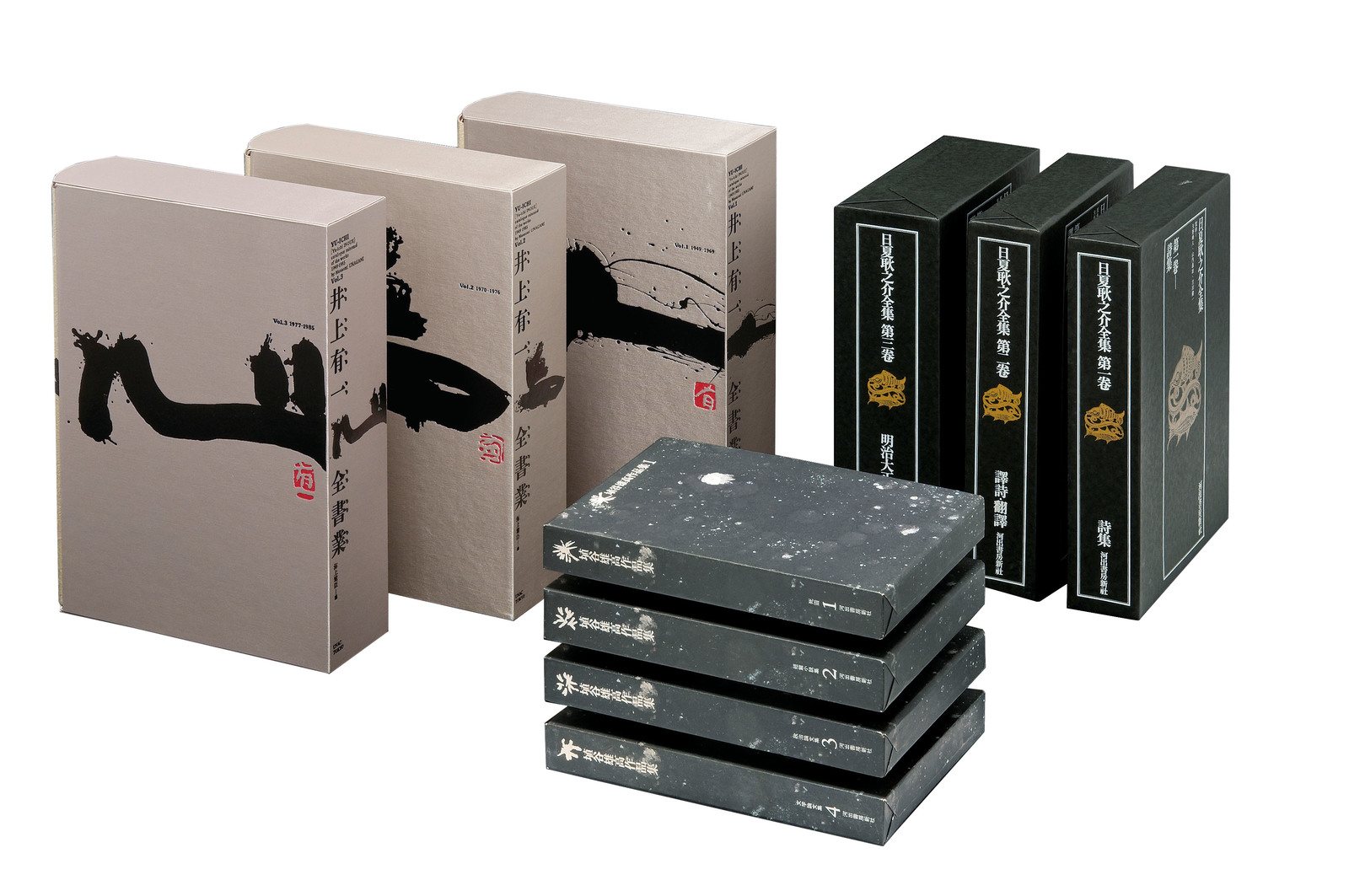 『日夏耿之介全集』の函は、黒色紙に、シルクスクリーン2色刷り。密度の濃い高踏的文学世界を、静かに表象している。