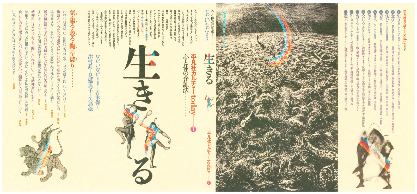 「10の動詞」をテーマとして編集された、10冊のディスカッション・ドラマ。 多彩な論客たちが一堂に会し、1980年代初頭の日本社会のあり方を重層的な視点で切り取ってゆく。対論後の感想を記す、各人のエッセイが加えられた。 カバーは、キ・アカ・アイの3色刷り。3色の刷り重ねで黒色を生みだす。この黒色(インクによる減色混合)から各色を削りだす独特の手法による「虹色の滲み」がカバーの表、背、裏など、随所に出没する。 動詞テーマを生き生きと増殖させるイメージ(図版ページ)が本文ページに等間隔で挿入され、各冊の小口にリズミカルな繰り返しの黒オビ文様を出現させる。 協力=赤崎正一 二、ゆらぎ・うつろう シリーズ全集|(リズム)を生み出す カバー表紙|(表紙―背―裏表紙)図形+文字 カバー表紙|(色を削りだす)削り |