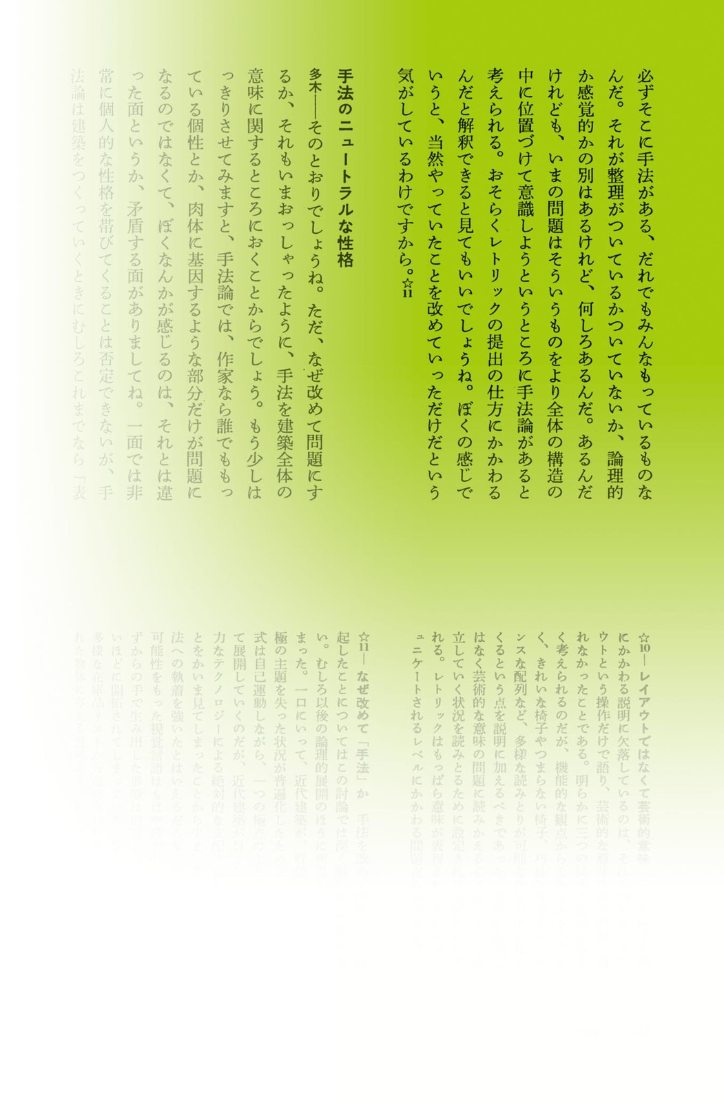 ひとりのインタビュアーによる、4~5人の建築家・デザイナーとの公開対談を記録したシリーズ。先端を走る創作者たちの、「現場の今」の声を伝える。 第1巻は、杉浦自身をふくむ、多木浩二によるもの。4人の対話者の本文頁は、それぞれに異なる色紙が用いられた。本の小口の色変化を意識した、地層学的発想の最初期の試み。 杉浦はこの対話の中で、デザインについてはいっさい触れず、「視覚」と「図の発生」の原理についての自説を語った。 協力=中垣信夫+海保透 二、ゆらぎ・うつろう 本文|小口に(地層)を滲ませる |