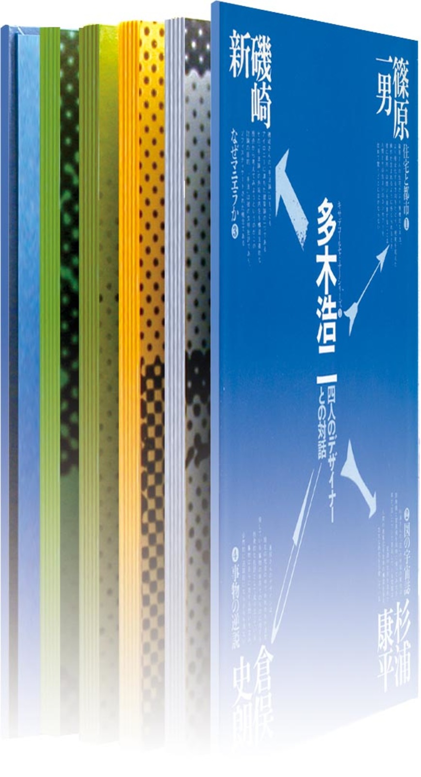 ひとりのインタビュアーによる、4~5人の建築家・デザイナーとの公開対談を記録したシリーズ。先端を走る創作者たちの、「現場の今」の声を伝える。 第1巻は、杉浦自身をふくむ、多木浩二によるもの。4人の対話者の本文頁は、それぞれに異なる色紙が用いられた。本の小口の色変化を意識した、地層学的発想の最初期の試み。 杉浦はこの対話の中で、デザインについてはいっさい触れず、「視覚」と「図の発生」の原理についての自説を語った。 協力=中垣信夫+海保透 二、ゆらぎ・うつろう 本文|小口に(地層)を滲ませる |