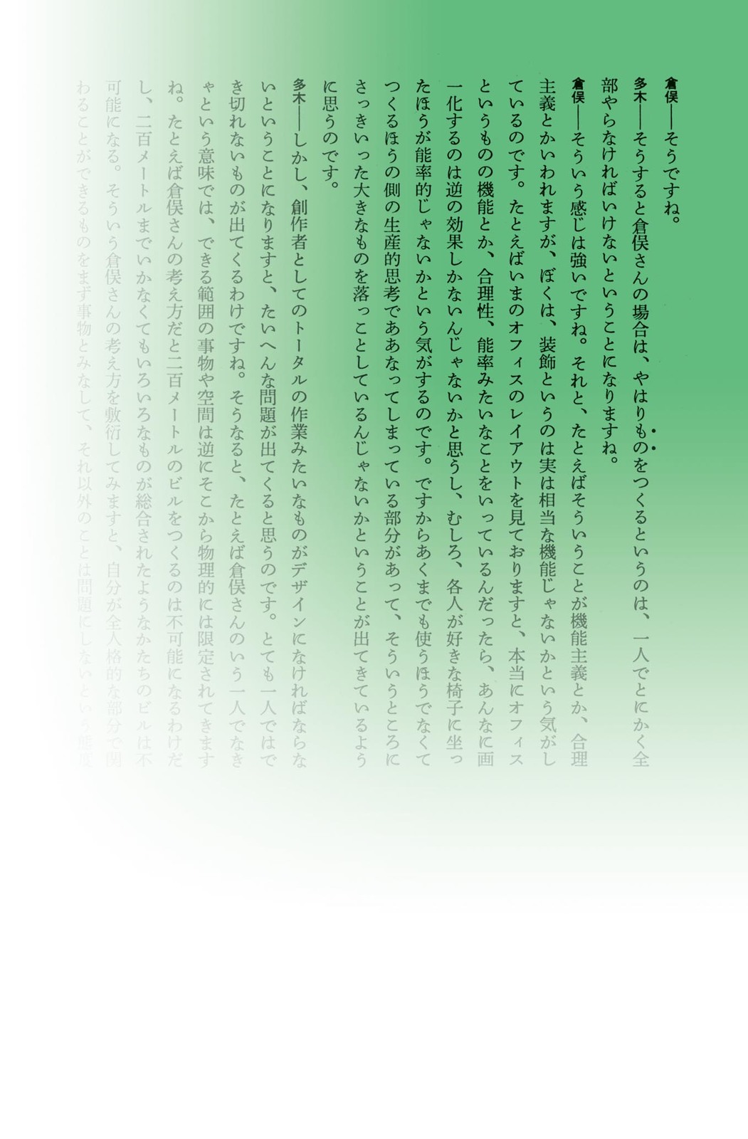 ひとりのインタビュアーによる、4~5人の建築家・デザイナーとの公開対談を記録したシリーズ。先端を走る創作者たちの、「現場の今」の声を伝える。 第1巻は、杉浦自身をふくむ、多木浩二によるもの。4人の対話者の本文頁は、それぞれに異なる色紙が用いられた。本の小口の色変化を意識した、地層学的発想の最初期の試み。 杉浦はこの対話の中で、デザインについてはいっさい触れず、「視覚」と「図の発生」の原理についての自説を語った。 協力=中垣信夫+海保透 二、ゆらぎ・うつろう 本文|小口に(地層)を滲ませる |