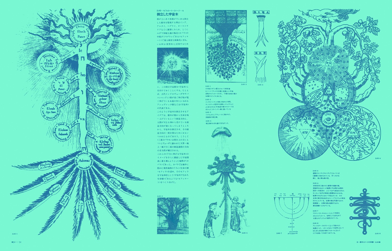 各章ごとに異なる地色が配され、白を背景とする紙面は1ページも無い。めまいするほどに詰めこまれた図像群は、近代デザインの語法が忘れ去ってしまったもの。その一つ一つが、宇宙の森羅万象に眼をとどかせようとする、人類の図像的想像力の結晶である。松岡のテキストが、各図が語る内容を、絶妙に結びつける。