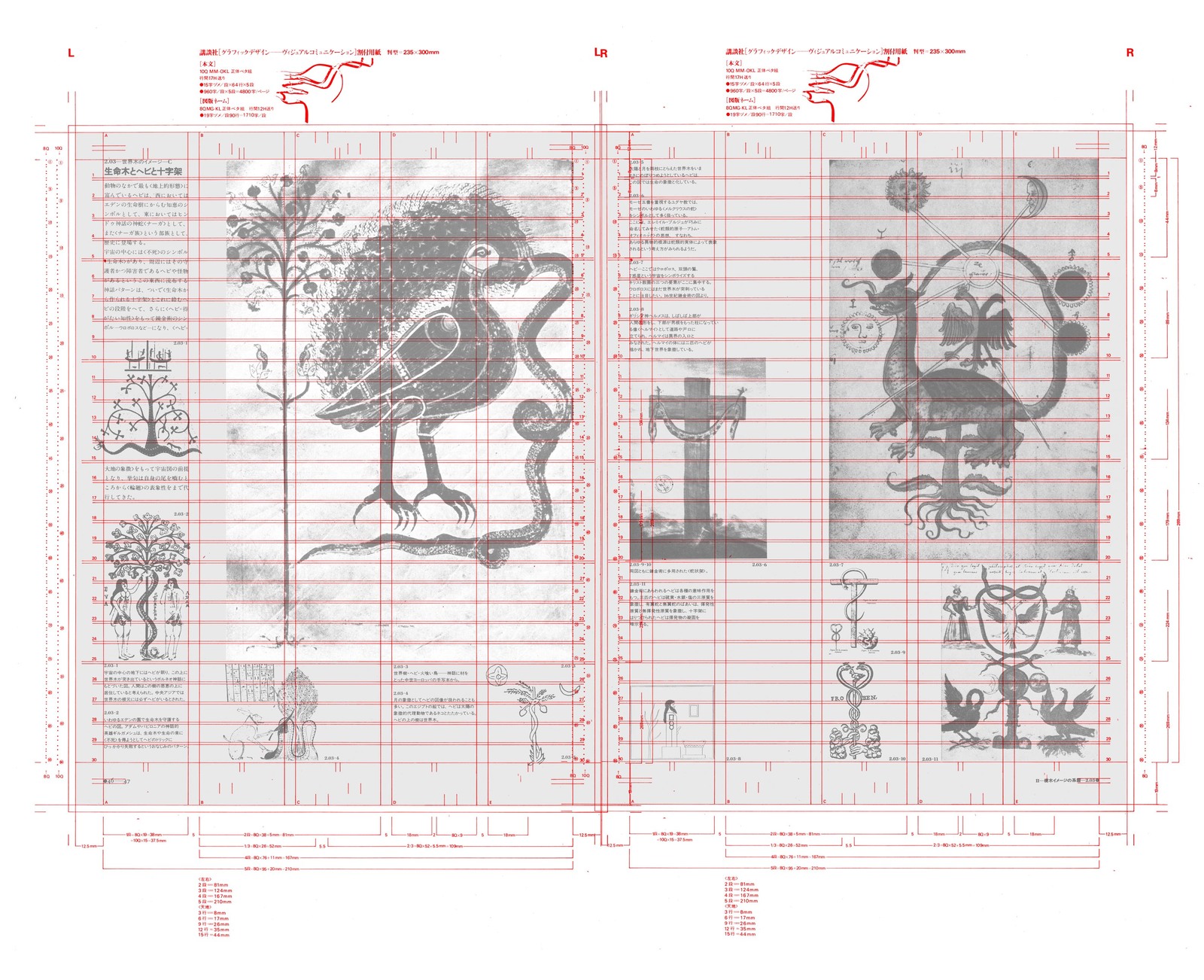 本文レイアウトの背後には、周到に用意されたグリッドシステムが隠れこみ、微細な図像にいたるまで、その大きさ、位置、ネームとの関係……などを支配している。真の意味で、「実験」の名で呼ぶことができる出版物。
