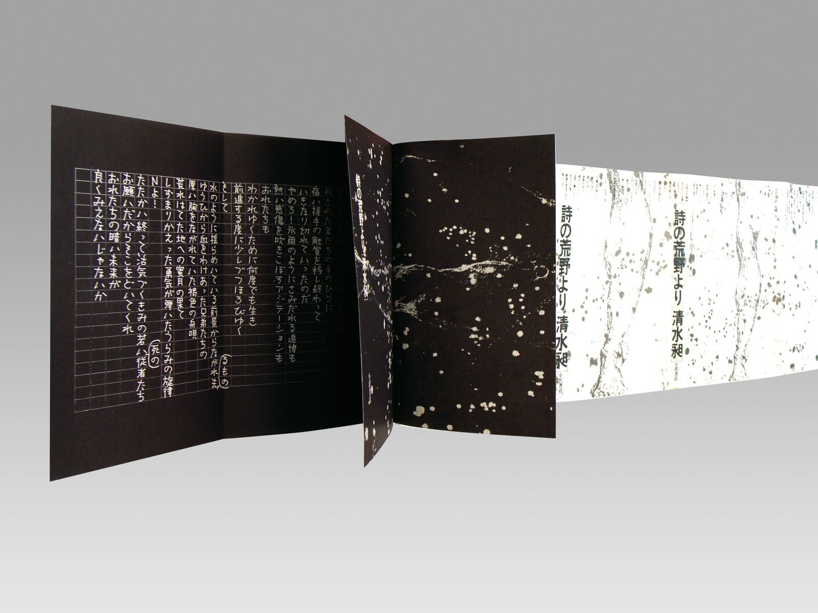 汚れを防ぐ目的で、本に巻きつくカバー。一枚のカバーは、表・背・裏と続き、左右に両袖がついて、一つながりの空間を形づくる。ふつう、平積みの本では表紙側が、棚ざしの本では背側が眼に留まる面となる。表と背は別々に自立し、分離して考えられる。内側に折りこまれた袖は、外からは見えない面である。 杉浦デザインでは、「背から表紙、袖にかけて」を一つながりの空間ととらえるデザインが、いくつとなく見いだされる。背にはじまる文章が表紙・袖へと連続してゆき、視線の動きに誘導されて、思わず表紙をめくってしまう。 本の立体性・三次元性を残しながら、なお、カバー空間を連続体としてとらえようとする試み。 『詩の荒野より』と『夜動く』は、カバーからソデ、オモテ表紙、背、ウラ表紙まで、ぐるりと文章がつながっている。本の内容を説明する惹句は、ふつう表1なり表4に入るのだが、エンドレスに文字が円環することで、「書物各部の領域の溶解」を意図した試みとして注目される。 四、脈動する本 カバー表紙|(表紙―背―裏表紙)テキスト+詩 |