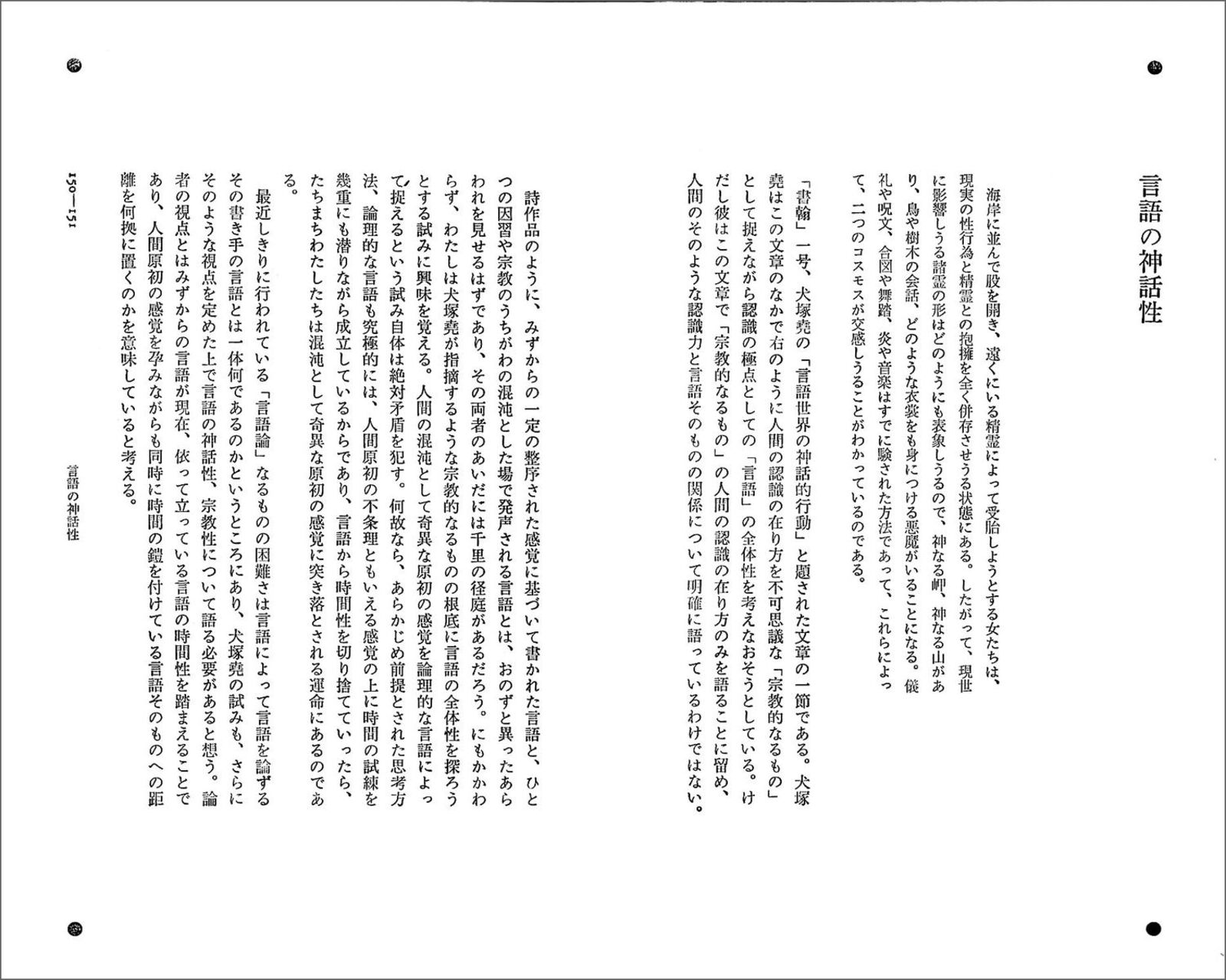 汚れを防ぐ目的で、本に巻きつくカバー。一枚のカバーは、表・背・裏と続き、左右に両袖がついて、一つながりの空間を形づくる。ふつう、平積みの本では表紙側が、棚ざしの本では背側が眼に留まる面となる。表と背は別々に自立し、分離して考えられる。内側に折りこまれた袖は、外からは見えない面である。 杉浦デザインでは、「背から表紙、袖にかけて」を一つながりの空間ととらえるデザインが、いくつとなく見いだされる。背にはじまる文章が表紙・袖へと連続してゆき、視線の動きに誘導されて、思わず表紙をめくってしまう。 本の立体性・三次元性を残しながら、なお、カバー空間を連続体としてとらえようとする試み。 『詩の荒野より』と『夜動く』は、カバーからソデ、オモテ表紙、背、ウラ表紙まで、ぐるりと文章がつながっている。本の内容を説明する惹句は、ふつう表1なり表4に入るのだが、エンドレスに文字が円環することで、「書物各部の領域の溶解」を意図した試みとして注目される。 四、脈動する本 カバー表紙|(表紙―背―裏表紙)テキスト+詩 |