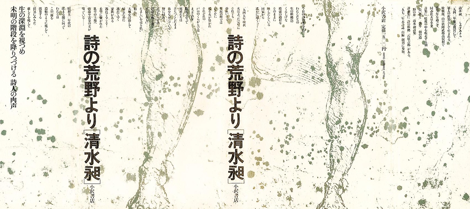 汚れを防ぐ目的で、本に巻きつくカバー。一枚のカバーは、表・背・裏と続き、左右に両袖がついて、一つながりの空間を形づくる。ふつう、平積みの本では表紙側が、棚ざしの本では背側が眼に留まる面となる。表と背は別々に自立し、分離して考えられる。内側に折りこまれた袖は、外からは見えない面である。 杉浦デザインでは、「背から表紙、袖にかけて」を一つながりの空間ととらえるデザインが、いくつとなく見いだされる。背にはじまる文章が表紙・袖へと連続してゆき、視線の動きに誘導されて、思わず表紙をめくってしまう。 本の立体性・三次元性を残しながら、なお、カバー空間を連続体としてとらえようとする試み。 『詩の荒野より』と『夜動く』は、カバーからソデ、オモテ表紙、背、ウラ表紙まで、ぐるりと文章がつながっている。本の内容を説明する惹句は、ふつう表1なり表4に入るのだが、エンドレスに文字が円環することで、「書物各部の領域の溶解」を意図した試みとして注目される。 四、脈動する本 カバー表紙|(表紙―背―裏表紙)テキスト+詩 |
