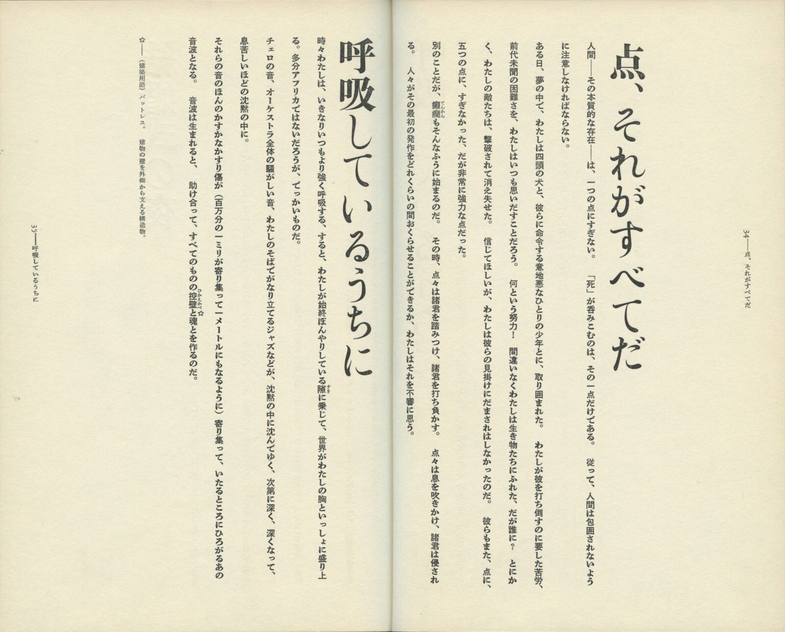 汚れを防ぐ目的で、本に巻きつくカバー。一枚のカバーは、表・背・裏と続き、左右に両袖がついて、一つながりの空間を形づくる。ふつう、平積みの本では表紙側が、棚ざしの本では背側が眼に留まる面となる。表と背は別々に自立し、分離して考えられる。内側に折りこまれた袖は、外からは見えない面である。 杉浦デザインでは、「背から表紙、袖にかけて」を一つながりの空間ととらえるデザインが、いくつとなく見いだされる。背にはじまる文章が表紙・袖へと連続してゆき、視線の動きに誘導されて、思わず表紙をめくってしまう。 本の立体性・三次元性を残しながら、なお、カバー空間を連続体としてとらえようとする試み。 『詩の荒野より』と『夜動く』は、カバーからソデ、オモテ表紙、背、ウラ表紙まで、ぐるりと文章がつながっている。本の内容を説明する惹句は、ふつう表1なり表4に入るのだが、エンドレスに文字が円環することで、「書物各部の領域の溶解」を意図した試みとして注目される。 四、脈動する本 カバー表紙|(表紙―背―裏表紙)テキスト+詩 |