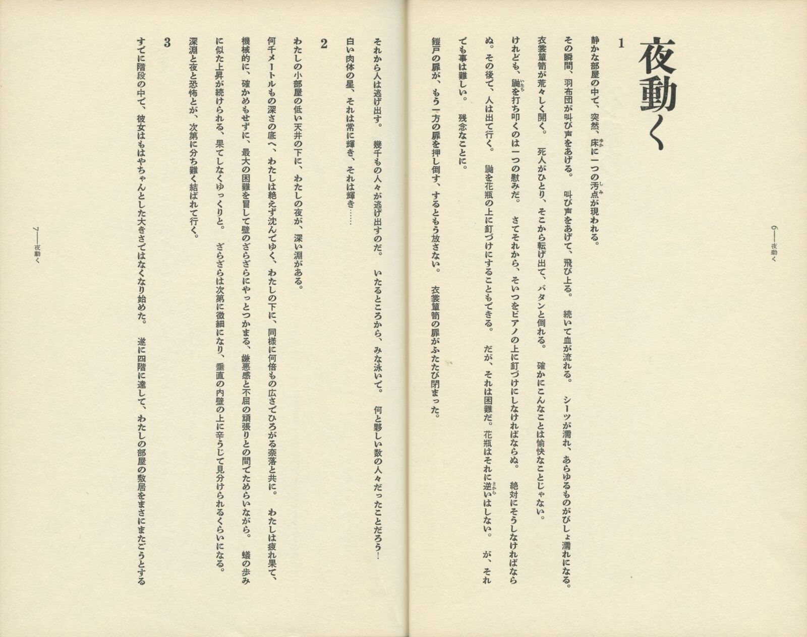 汚れを防ぐ目的で、本に巻きつくカバー。一枚のカバーは、表・背・裏と続き、左右に両袖がついて、一つながりの空間を形づくる。ふつう、平積みの本では表紙側が、棚ざしの本では背側が眼に留まる面となる。表と背は別々に自立し、分離して考えられる。内側に折りこまれた袖は、外からは見えない面である。 杉浦デザインでは、「背から表紙、袖にかけて」を一つながりの空間ととらえるデザインが、いくつとなく見いだされる。背にはじまる文章が表紙・袖へと連続してゆき、視線の動きに誘導されて、思わず表紙をめくってしまう。 本の立体性・三次元性を残しながら、なお、カバー空間を連続体としてとらえようとする試み。 『詩の荒野より』と『夜動く』は、カバーからソデ、オモテ表紙、背、ウラ表紙まで、ぐるりと文章がつながっている。本の内容を説明する惹句は、ふつう表1なり表4に入るのだが、エンドレスに文字が円環することで、「書物各部の領域の溶解」を意図した試みとして注目される。 四、脈動する本 カバー表紙|(表紙―背―裏表紙)テキスト+詩 |