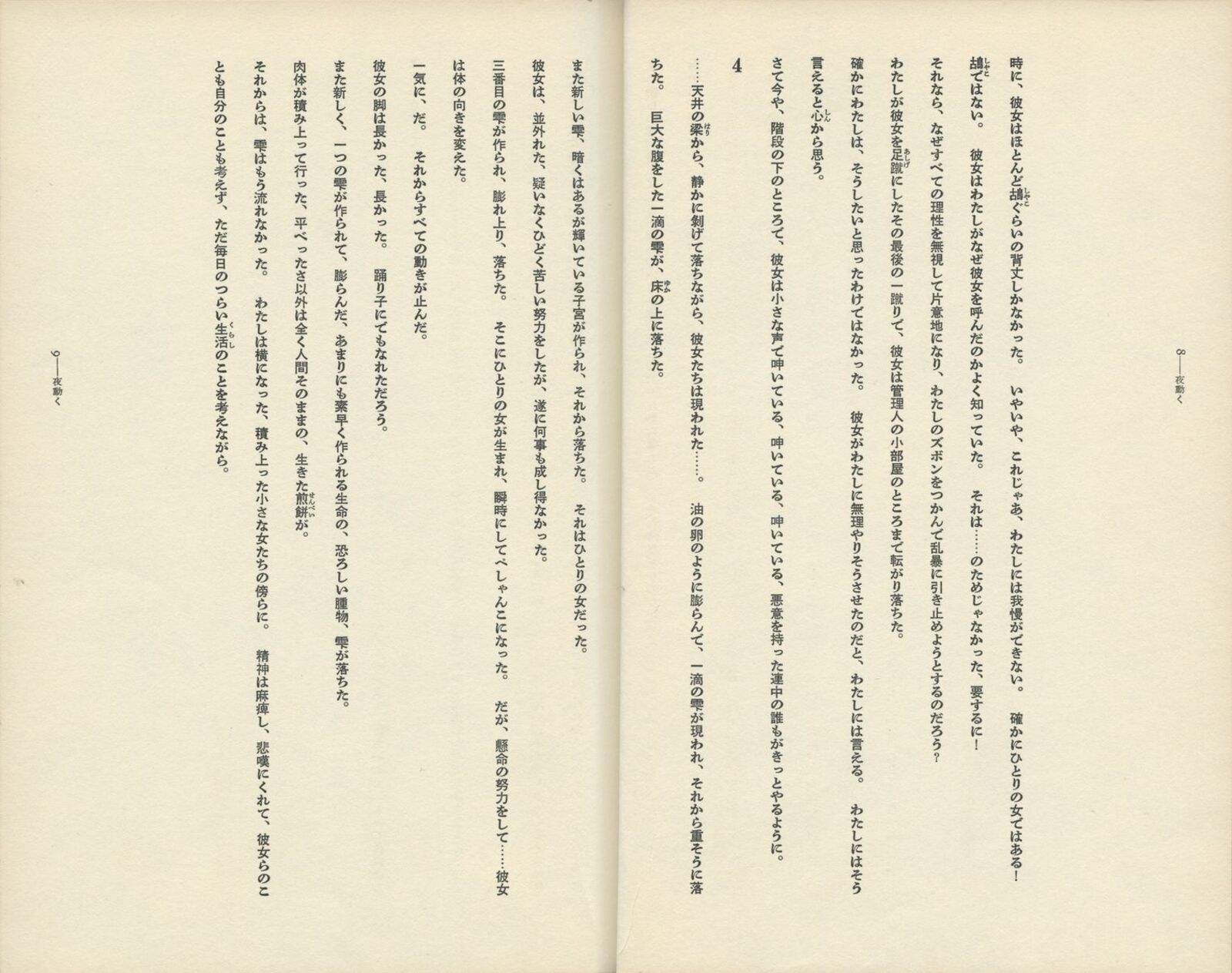 汚れを防ぐ目的で、本に巻きつくカバー。一枚のカバーは、表・背・裏と続き、左右に両袖がついて、一つながりの空間を形づくる。ふつう、平積みの本では表紙側が、棚ざしの本では背側が眼に留まる面となる。表と背は別々に自立し、分離して考えられる。内側に折りこまれた袖は、外からは見えない面である。 杉浦デザインでは、「背から表紙、袖にかけて」を一つながりの空間ととらえるデザインが、いくつとなく見いだされる。背にはじまる文章が表紙・袖へと連続してゆき、視線の動きに誘導されて、思わず表紙をめくってしまう。 本の立体性・三次元性を残しながら、なお、カバー空間を連続体としてとらえようとする試み。 『詩の荒野より』と『夜動く』は、カバーからソデ、オモテ表紙、背、ウラ表紙まで、ぐるりと文章がつながっている。本の内容を説明する惹句は、ふつう表1なり表4に入るのだが、エンドレスに文字が円環することで、「書物各部の領域の溶解」を意図した試みとして注目される。 四、脈動する本 カバー表紙|(表紙―背―裏表紙)テキスト+詩 |