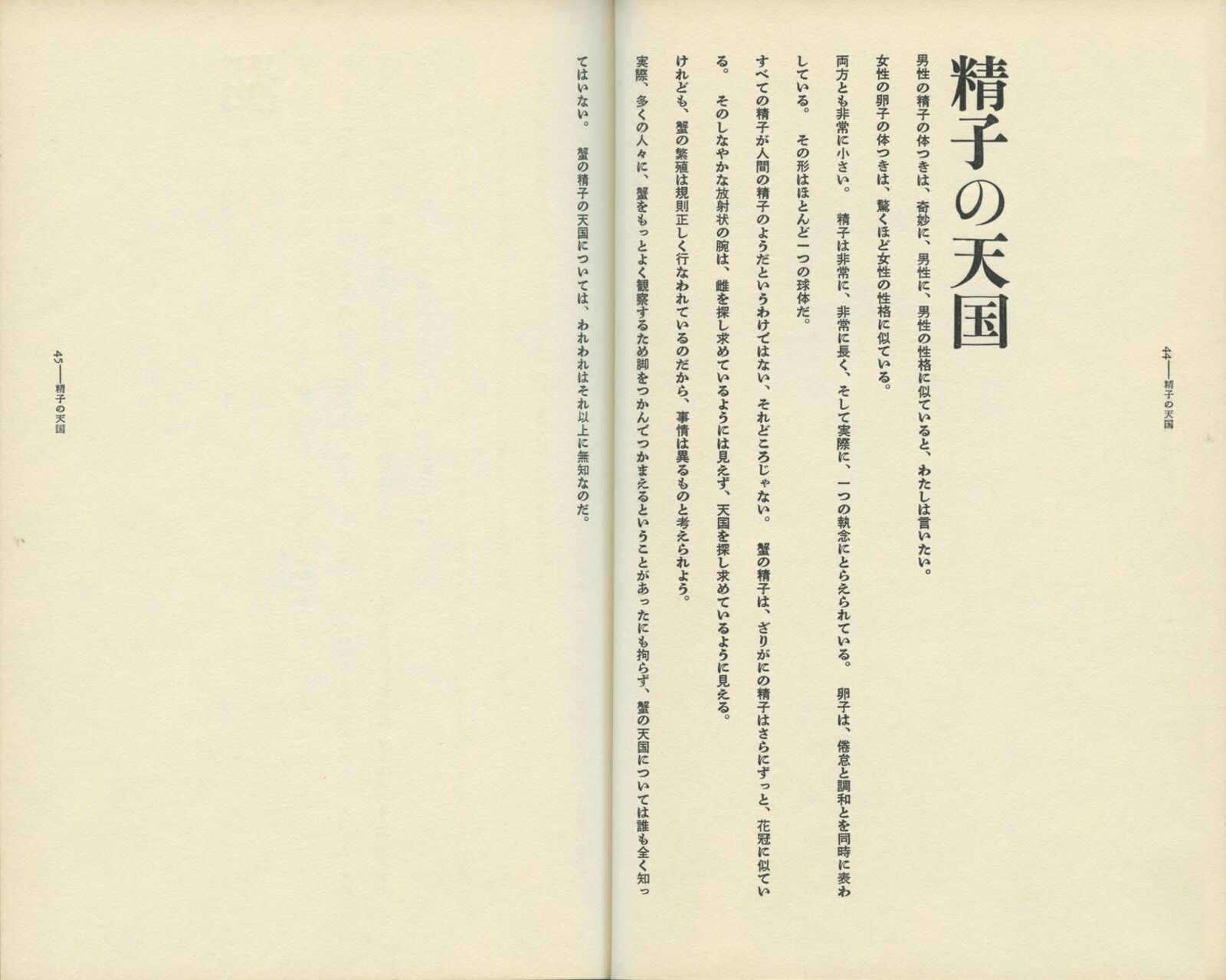 汚れを防ぐ目的で、本に巻きつくカバー。一枚のカバーは、表・背・裏と続き、左右に両袖がついて、一つながりの空間を形づくる。ふつう、平積みの本では表紙側が、棚ざしの本では背側が眼に留まる面となる。表と背は別々に自立し、分離して考えられる。内側に折りこまれた袖は、外からは見えない面である。 杉浦デザインでは、「背から表紙、袖にかけて」を一つながりの空間ととらえるデザインが、いくつとなく見いだされる。背にはじまる文章が表紙・袖へと連続してゆき、視線の動きに誘導されて、思わず表紙をめくってしまう。 本の立体性・三次元性を残しながら、なお、カバー空間を連続体としてとらえようとする試み。 『詩の荒野より』と『夜動く』は、カバーからソデ、オモテ表紙、背、ウラ表紙まで、ぐるりと文章がつながっている。本の内容を説明する惹句は、ふつう表1なり表4に入るのだが、エンドレスに文字が円環することで、「書物各部の領域の溶解」を意図した試みとして注目される。 四、脈動する本 カバー表紙|(表紙―背―裏表紙)テキスト+詩 |