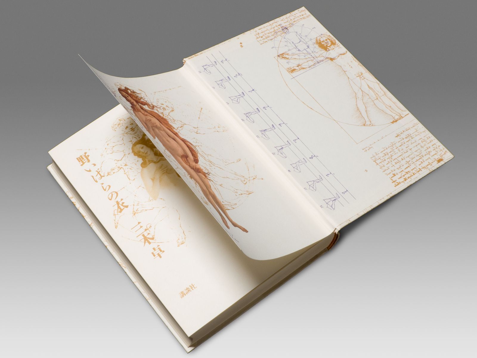 一冊の小説本を、内容にふさわしい一つのイメージのゆらぎ・うつろいで連鎖させ、テキストに絡ませ、溶けあわせる……。 ボッティチェルリのヴィーナス女神像、レオナルドの人体動作分析など、ルネサンス的「完全身体」探究のイコノロジーの重層的展開が、カバー・本表紙・見返しへと連続して、イメージの円環をなす。 杉浦デザインによる、小説本のつくり方を示す典型。 四、脈動する本 文字 |表紙(カバー)から本文へ……(連続) |