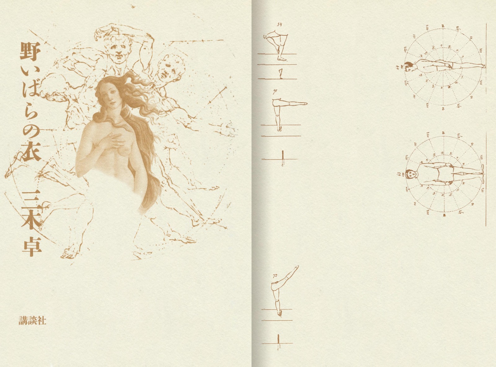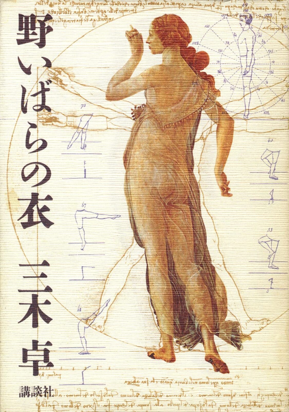 一冊の小説本を、内容にふさわしい一つのイメージのゆらぎ・うつろいで連鎖させ、テキストに絡ませ、溶けあわせる……。 ボッティチェルリのヴィーナス女神像、レオナルドの人体動作分析など、ルネサンス的「完全身体」探究のイコノロジーの重層的展開が、カバー・本表紙・見返しへと連続して、イメージの円環をなす。 杉浦デザインによる、小説本のつくり方を示す典型。 四、脈動する本 文字 |表紙(カバー)から本文へ……(連続) |