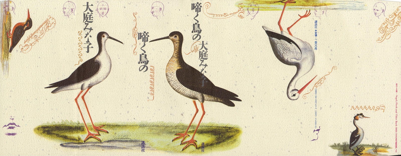 一冊の小説本を、内容にふさわしい一つのイメージのゆらぎ・うつろいで連鎖させ、テキストに絡ませ、溶けあわせる……。 着彩エッチングによる鳥の博物学図像が、カバー各部で嘴を交わす。非重力的な「つぶやき」を想わせる淡い線画が、タイトル文字やその周囲の空間を漂う。 「つぶやき」の文字は、鳥語をイメージしている。 協力=赤崎正一 四、脈動する本 文字 |表紙(カバー)から本文へ……(連続) |
