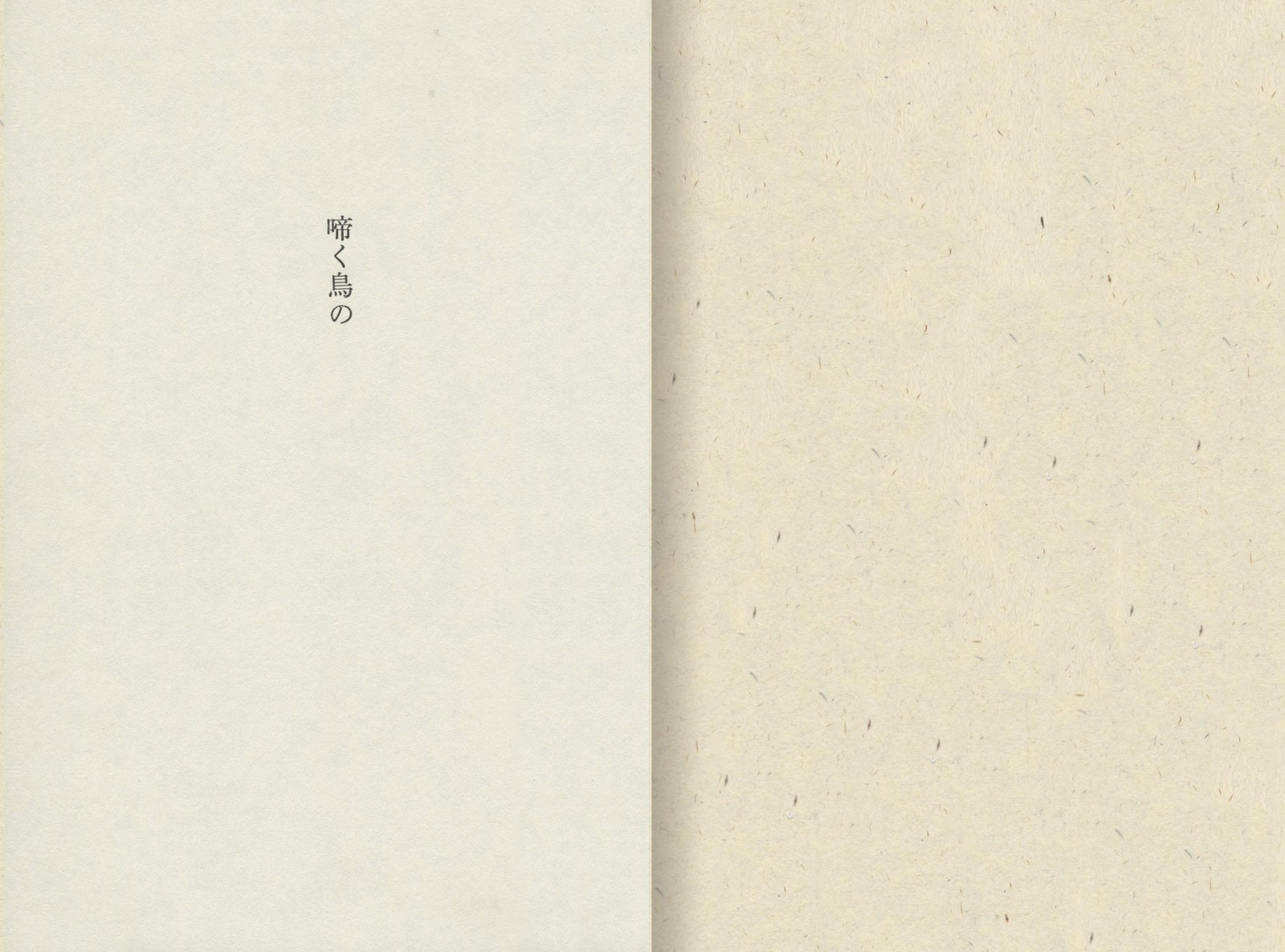一冊の小説本を、内容にふさわしい一つのイメージのゆらぎ・うつろいで連鎖させ、テキストに絡ませ、溶けあわせる……。 着彩エッチングによる鳥の博物学図像が、カバー各部で嘴を交わす。非重力的な「つぶやき」を想わせる淡い線画が、タイトル文字やその周囲の空間を漂う。 「つぶやき」の文字は、鳥語をイメージしている。 協力=赤崎正一 四、脈動する本 文字 |表紙(カバー)から本文へ……(連続) |