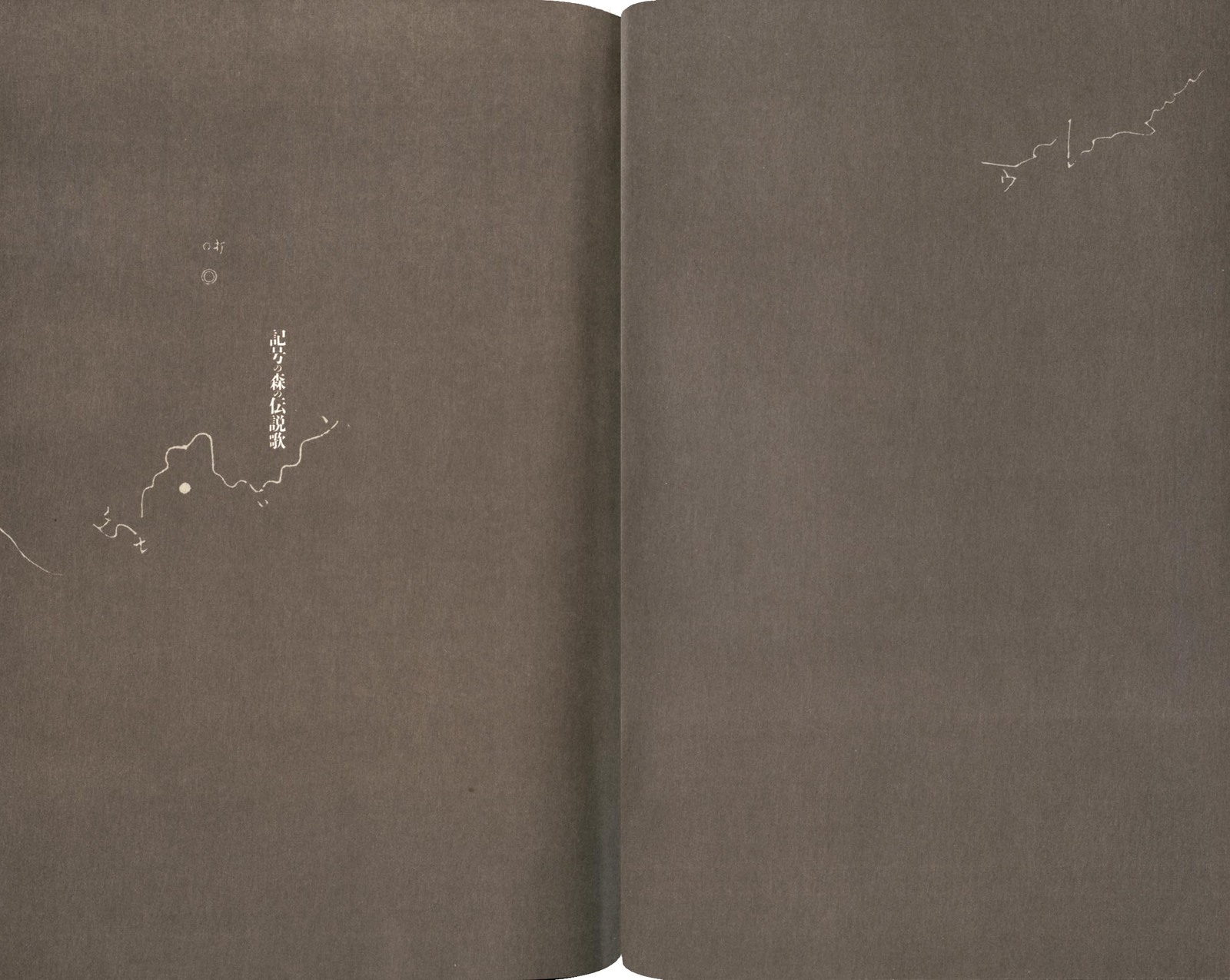 戦後を代表する思想家、詩人でもある吉本隆明が、折々に詠んだ長編詩。1986年にまとめられた。 民族的記憶の古層に根ざす詩のことばは山野をただよう言霊の流れとして、天地が不ぞろいになる、「センター揃え組」で表現された。ページの縁に滲む山川草木の映像を避けるように漂って配置される。杉浦の異例な提案を詩人は快諾し、漂泊感漂う本文組が実現した。 本書に収められた7編の長編詩には、詩を巡るページの余白の隅々に、風景画が現れる。日本の絵巻から引用された山水の景観が、章を追い、ゆっくりと右回りに旋回する。その動きが滲みとなって、小口を染めあげる。 周囲に配された山野の図は、≪信貴山縁起絵巻≫などの絵巻の画面の片隅から選ばれた。 函・表紙・見返し・扉・目次……と波のように上下しながら連綿し、円環する符号は、声明譜など日本の伝統音楽の記譜に由来するもの。詩のことばは限りない、声となって、響きわたる。 協力=赤崎正一 四、脈動する本 本文|(章ごとに異なる)レイアウト 本文|小口に(地層)を滲ませる |
