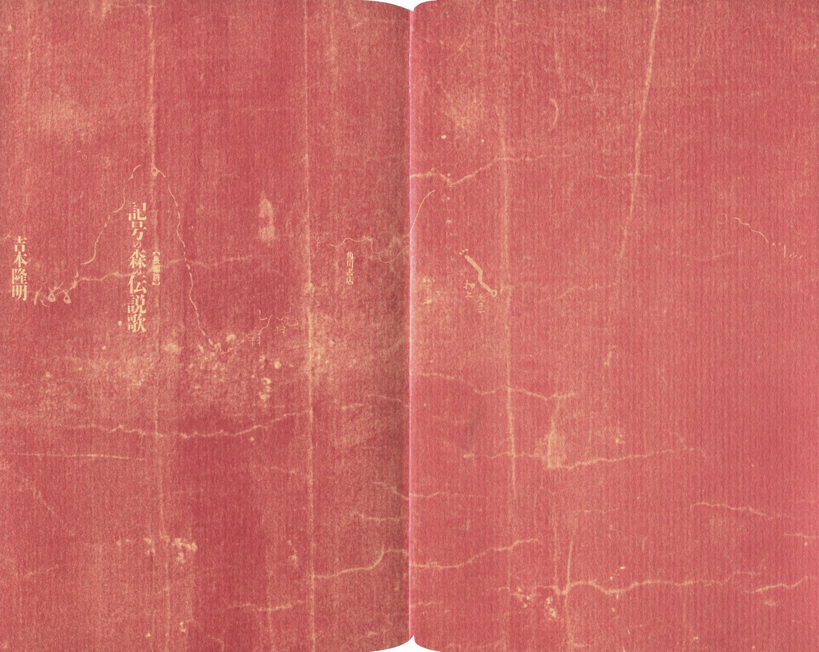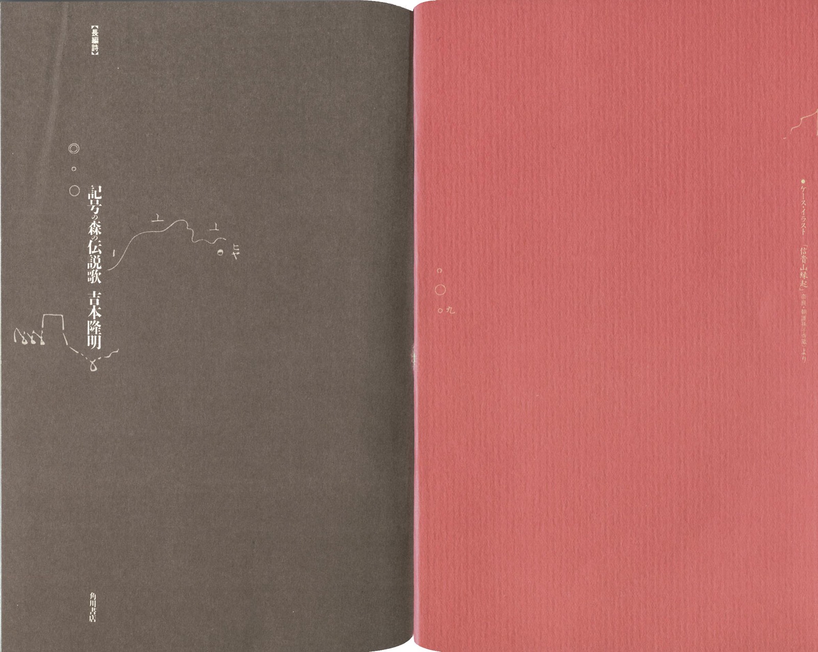戦後を代表する思想家、詩人でもある吉本隆明が、折々に詠んだ長編詩。1986年にまとめられた。 民族的記憶の古層に根ざす詩のことばは山野をただよう言霊の流れとして、天地が不ぞろいになる、「センター揃え組」で表現された。ページの縁に滲む山川草木の映像を避けるように漂って配置される。杉浦の異例な提案を詩人は快諾し、漂泊感漂う本文組が実現した。 本書に収められた7編の長編詩には、詩を巡るページの余白の隅々に、風景画が現れる。日本の絵巻から引用された山水の景観が、章を追い、ゆっくりと右回りに旋回する。その動きが滲みとなって、小口を染めあげる。 周囲に配された山野の図は、≪信貴山縁起絵巻≫などの絵巻の画面の片隅から選ばれた。 函・表紙・見返し・扉・目次……と波のように上下しながら連綿し、円環する符号は、声明譜など日本の伝統音楽の記譜に由来するもの。詩のことばは限りない、声となって、響きわたる。 協力=赤崎正一 四、脈動する本 本文|(章ごとに異なる)レイアウト 本文|小口に(地層)を滲ませる |