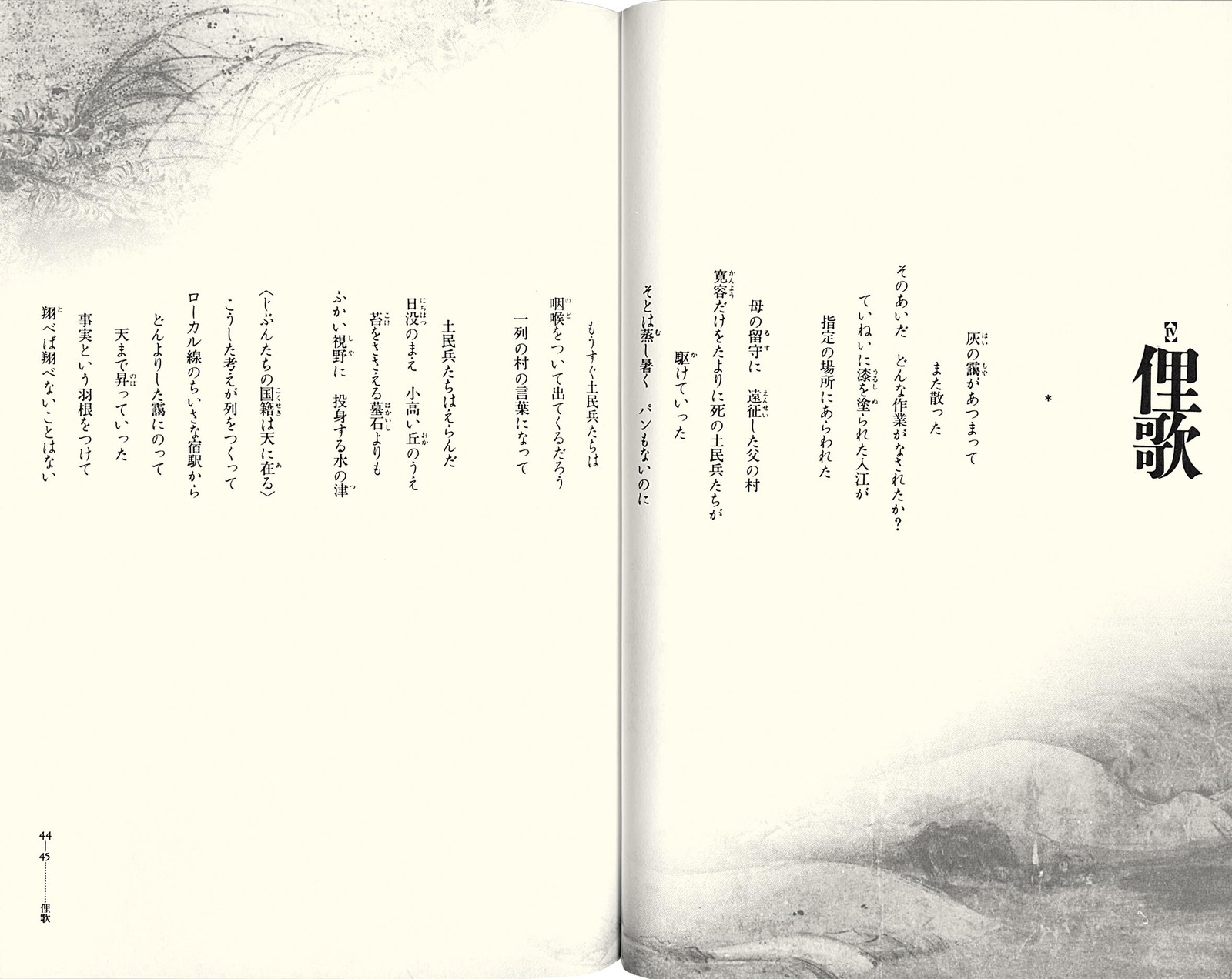 戦後を代表する思想家、詩人でもある吉本隆明が、折々に詠んだ長編詩。1986年にまとめられた。 民族的記憶の古層に根ざす詩のことばは山野をただよう言霊の流れとして、天地が不ぞろいになる、「センター揃え組」で表現された。ページの縁に滲む山川草木の映像を避けるように漂って配置される。杉浦の異例な提案を詩人は快諾し、漂泊感漂う本文組が実現した。 本書に収められた7編の長編詩には、詩を巡るページの余白の隅々に、風景画が現れる。日本の絵巻から引用された山水の景観が、章を追い、ゆっくりと右回りに旋回する。その動きが滲みとなって、小口を染めあげる。 周囲に配された山野の図は、≪信貴山縁起絵巻≫などの絵巻の画面の片隅から選ばれた。 函・表紙・見返し・扉・目次……と波のように上下しながら連綿し、円環する符号は、声明譜など日本の伝統音楽の記譜に由来するもの。詩のことばは限りない、声となって、響きわたる。 協力=赤崎正一 四、脈動する本 本文|(章ごとに異なる)レイアウト 本文|小口に(地層)を滲ませる |
