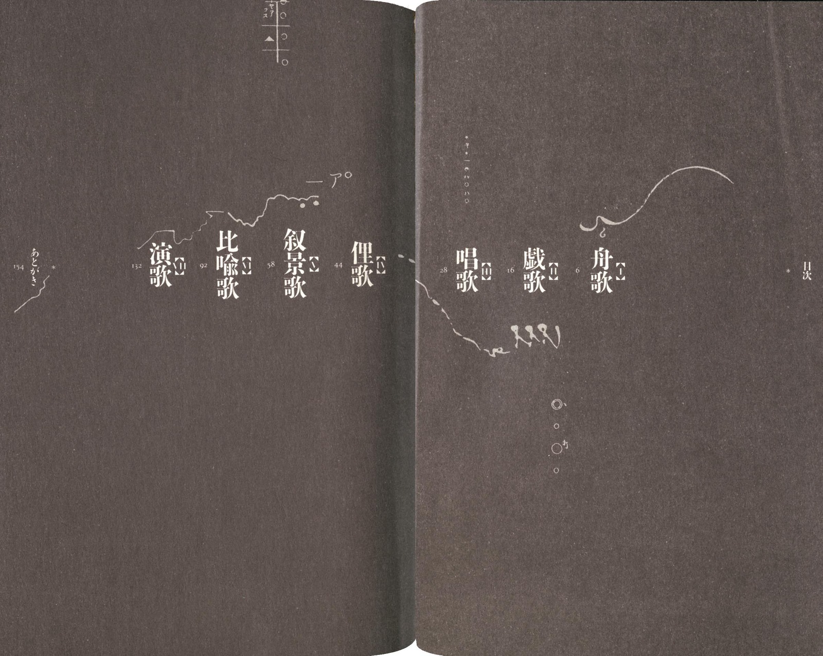 戦後を代表する思想家、詩人でもある吉本隆明が、折々に詠んだ長編詩。1986年にまとめられた。 民族的記憶の古層に根ざす詩のことばは山野をただよう言霊の流れとして、天地が不ぞろいになる、「センター揃え組」で表現された。ページの縁に滲む山川草木の映像を避けるように漂って配置される。杉浦の異例な提案を詩人は快諾し、漂泊感漂う本文組が実現した。 本書に収められた7編の長編詩には、詩を巡るページの余白の隅々に、風景画が現れる。日本の絵巻から引用された山水の景観が、章を追い、ゆっくりと右回りに旋回する。その動きが滲みとなって、小口を染めあげる。 周囲に配された山野の図は、≪信貴山縁起絵巻≫などの絵巻の画面の片隅から選ばれた。 函・表紙・見返し・扉・目次……と波のように上下しながら連綿し、円環する符号は、声明譜など日本の伝統音楽の記譜に由来するもの。詩のことばは限りない、声となって、響きわたる。 協力=赤崎正一 四、脈動する本 本文|(章ごとに異なる)レイアウト 本文|小口に(地層)を滲ませる |